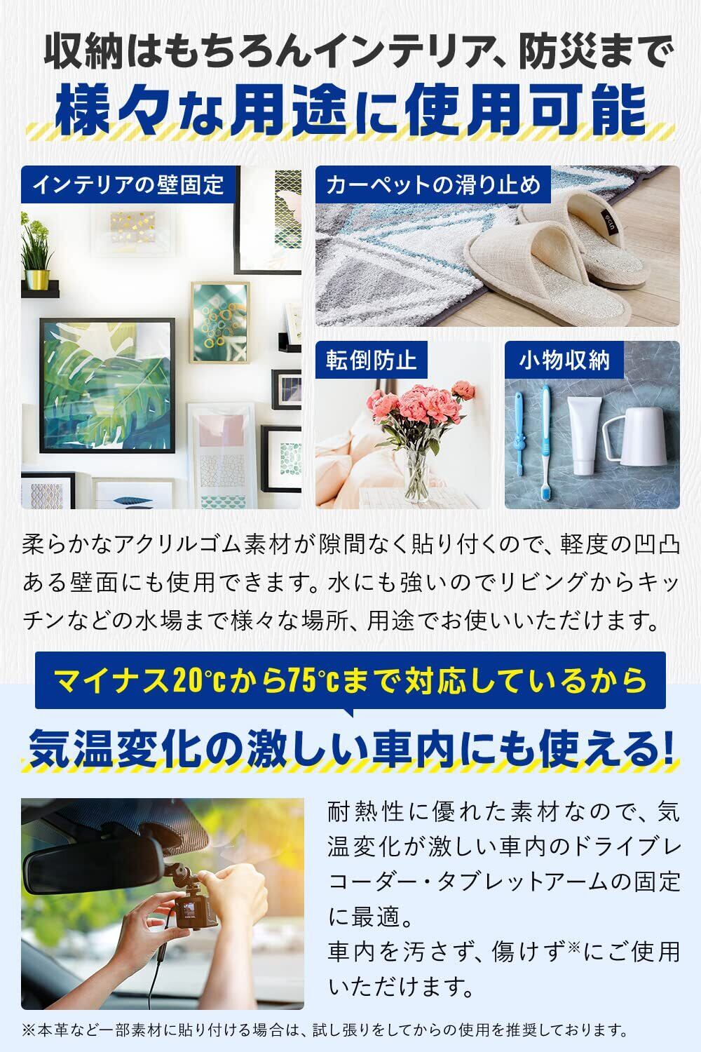【使用上の注意】強力な 粘着力の為、柔らかい素材の 壁紙 などへ使用した場合、剥がせる際に粘着面を傷める可能性があります。粘着 面の素材・固定する物の大きさにより耐荷重は変動いたします。使用の際は、お客様の判断のもと十分注意してご使用願います。