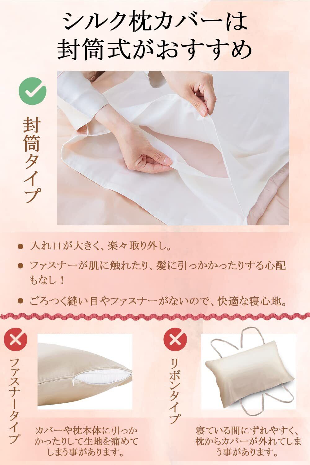【封筒式・贈り物におすすめ】美容を第一に考えるのであれば、封筒式枕カバーがおすすめです。封筒式なのでチャックなどの金具がなくストレスフリー!髪と肌に優しく、心地よい肌触りのUtukkyシルク枕カバーで、より一層快適な睡眠時間を。夏は涼しく、冬は暖かく、年間通して快適にお使いいただけます。Utukkyの上質なシルク商品は贈り物にもおすすめです。
