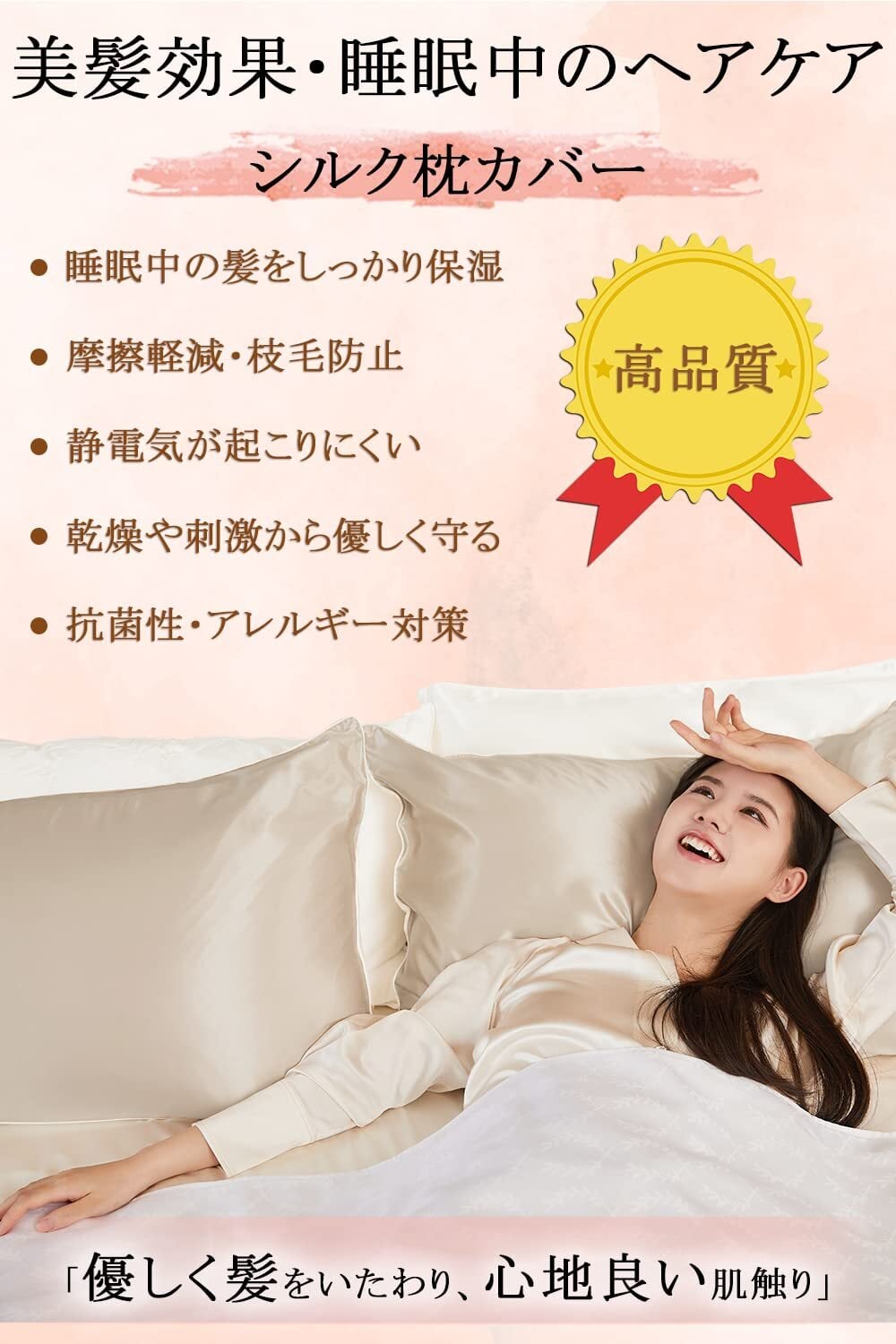 【抗菌性・静電気防止】シルク繊維は天然の保湿成分セリシンで覆われており、静電気が発生しにくく、朝の髪の乱れを軽減してくれます。シルク枕カバーは長く使っていくうちに、髪が段々柔らかく滑らかになって光沢がでてきたりと髪質改善を実感できます。シルク枕カバーは保湿性や通気性、保温性に優れているだけでなく、抗菌性にも優れているのでとっても衛生的。