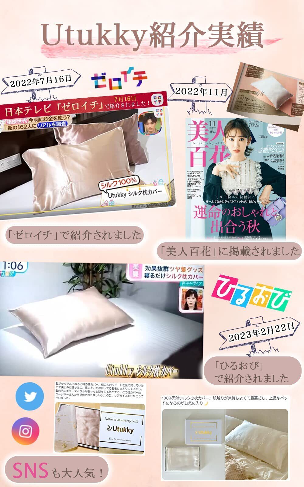 7月16日放送の日本テレビ「ゼロイチ」にてUtukkyシルク枕カバーが紹介されました!皆様のご愛顧ありがとうございます!【天然シルク・テンセル枕カバー】Utukkyシルク枕カバーは、片面に高品質の6 Aランクのシルクを採用し、もう片面にシルクのような滑らかな天糸(テンセル)を採用しています。シルク独特の光沢感で高級感のある一品。シルクは人間の肌と同じくたんぱく質で構成されているため、吸湿性と放湿性にも優れ、お肌に優しい! シルク枕カバーデビューにおすすめ!
