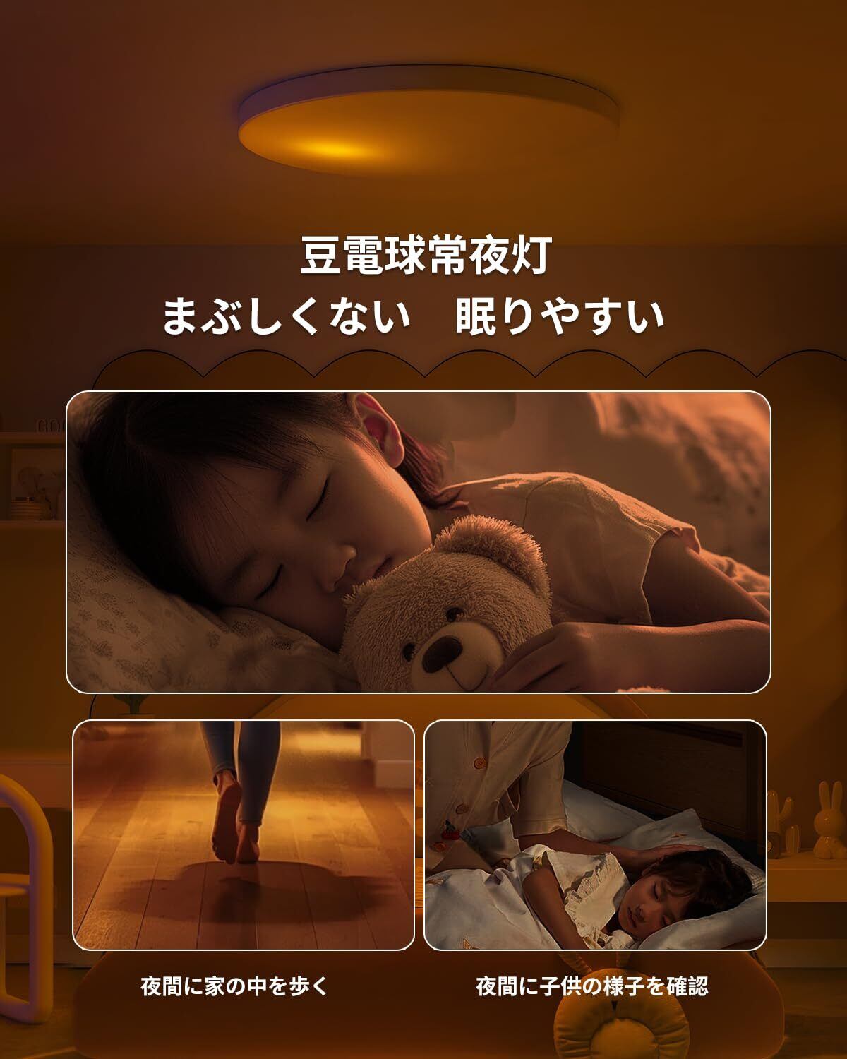 【豆電球常夜灯・記憶機能・定刻消灯】○本格的な豆電球常夜灯(1W):他社の眩しい全体発光式常夜灯と違って、1点だけ発光のため、ちょうどいい感じの暗さで目への刺激がなく、付けまま寝ることに最適です。○進化した記憶機能:他社の記憶機能は常夜灯によって前の設定がリセットされる方が多く、当天井照明器具はいろいろ設定してから常夜灯を使っても、次回点灯時にきちんと常夜灯前の設定を再現しますので、設定がリセットされるため毎日設定し直しの悩みがなくなります!○消灯機能:設定して15/30分後自動的に消灯するため、消し忘れの心配はありません。