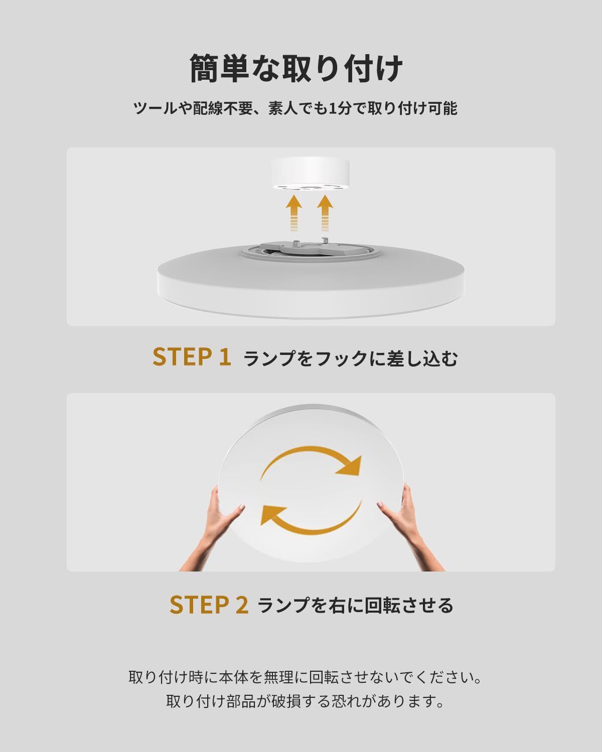 【ワンータッチ取付け】アダプターとライト本体の一体化設計のため、部品組み立ての必要がなく、シーリングライト全体を天井の引掛け装置に押し込んで、右回りに回転するだけで設置完了です。工具・配線も必要がなく、素人で1分間で取り付けます!