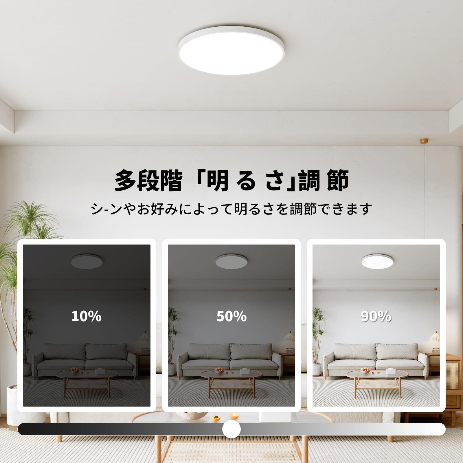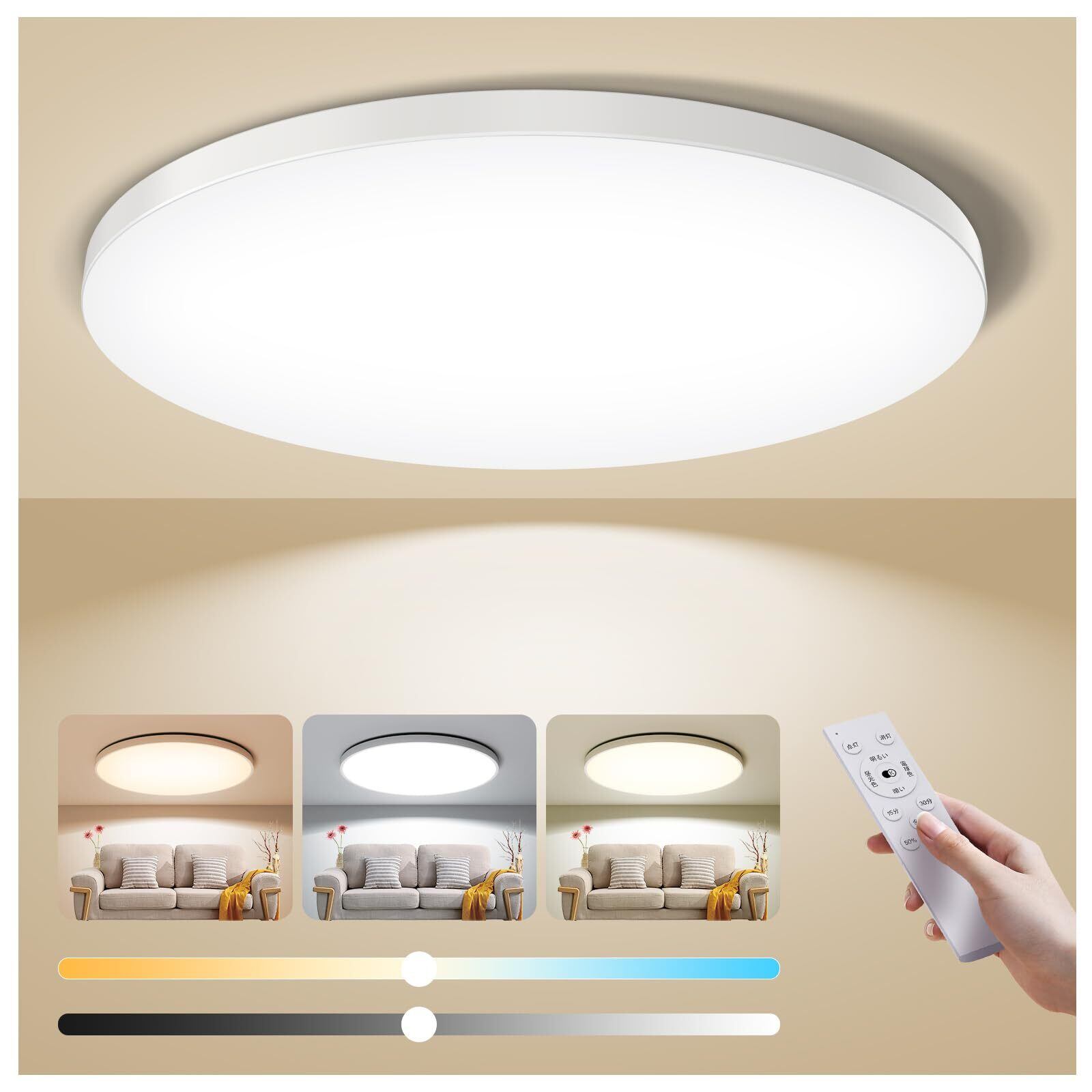【12段階調光+7段階調色】○多段階調整:リモコンで、12段階の明るさ調整(10~100%)と7段階の色温度調整(電球色3000k~昼光色6500k)できます。勉強や読書の時にスッキリした昼光色にしたり、家族団らんやリラックスの時に暖かい電球色にしたり、シーンに合わせて適応な色に調整できるため、このしりんぐらいと一つ機種でリビング/キッチン/寝室/書斎等あらゆるシーンに満足できます。 ○ワンータッチ切り替え:リモコンや壁スイッチで、ワンータッチで3つ色温度を切り替える(電球色/昼白色/昼光色)