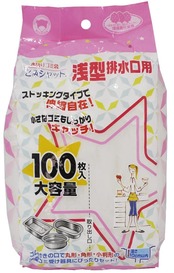 ストッキングタイプで伸縮自在な浅型排水口用の水切りネットです。小さなゴミもしっかりキャッチゴム付きの口でゴミ受け器具にぴったりセット