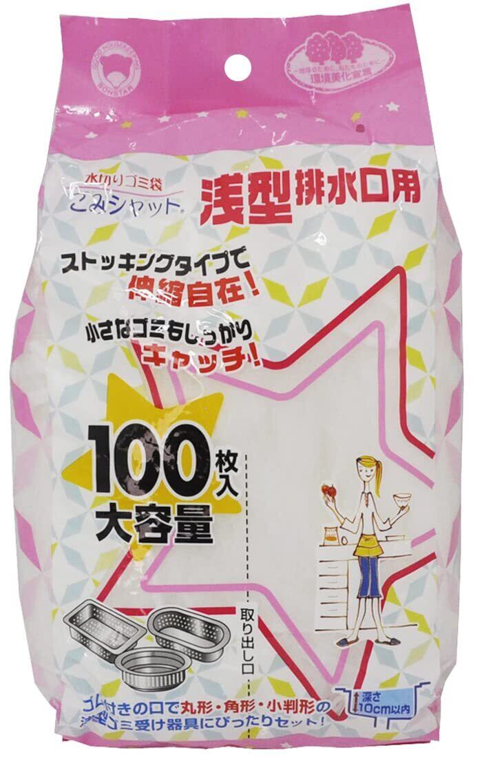 「ボンスター 水切りゴミ袋 ごみシャット」は、浅型排水口にぴったりな特別設計のゴミ袋です。ストッキングタイプで伸縮自在なので、簡単に取り付けることができます。100枚入りの大容量で、家庭用から業務用まで幅広く活用できます。