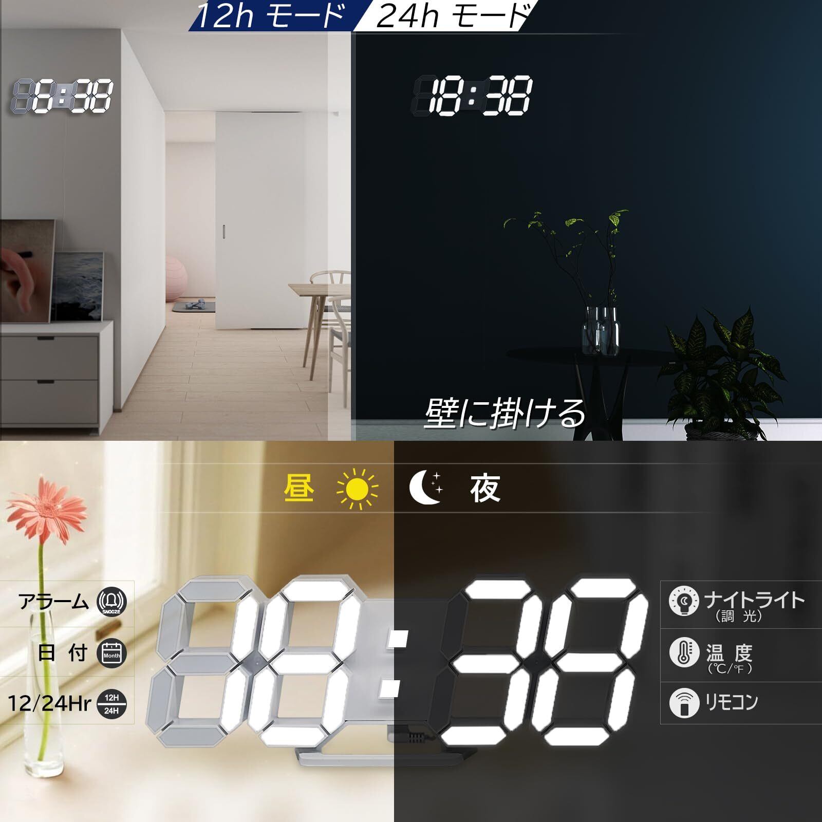 【3d Ledデジタル時計】現代的なデジタル時計、日付、時刻、温度(℃/℉)及び調整可能なナイトライトを表示し、 このクールな壁掛け時計は周囲の光に応じて8段階の自動調光機能が内蔵されています。リモコンで明るさを明るい/やや暗い/暗いの3段階で手動調整することもでき、夜間または遠距離からでも見やすく、クリアで大きく表示されます。