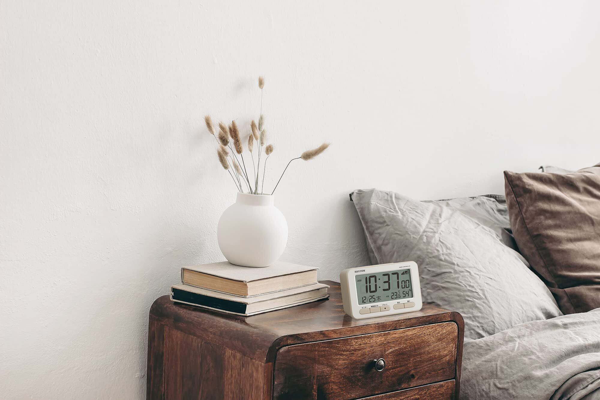 【見やすく優しいフォルムがちょうど良い】見やすい大きめのLCDと柔らかいフォルムが特徴の電波デジタル目覚まし時計です。