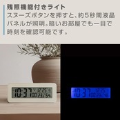 特徴:電波時計、デジタル表示、電子音アラーム、スヌーズ機能、温度計、湿度計、ライト、カレンダー表示