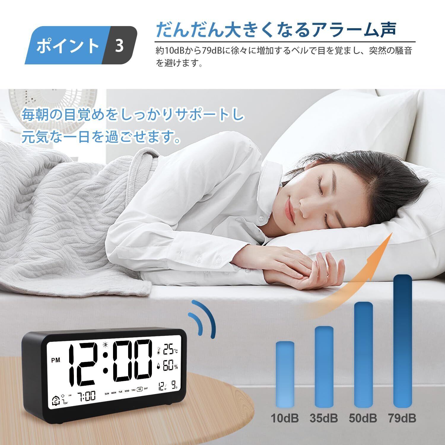 【バックライト調整自由&夜間点灯モード】目覚まし時計のトップのスイッチを長押しすることで、バックライトの明るさを個人の好みに合わせて自由に調整できます。また、夜間の時間帯を設定すると、その時刻になると自動的に点灯します。ナイトライトは柔らかく、眩しくないので、睡眠に影響を与えません。さらに、闇の中でも時計の情報をはっきりと読み取ることができます。