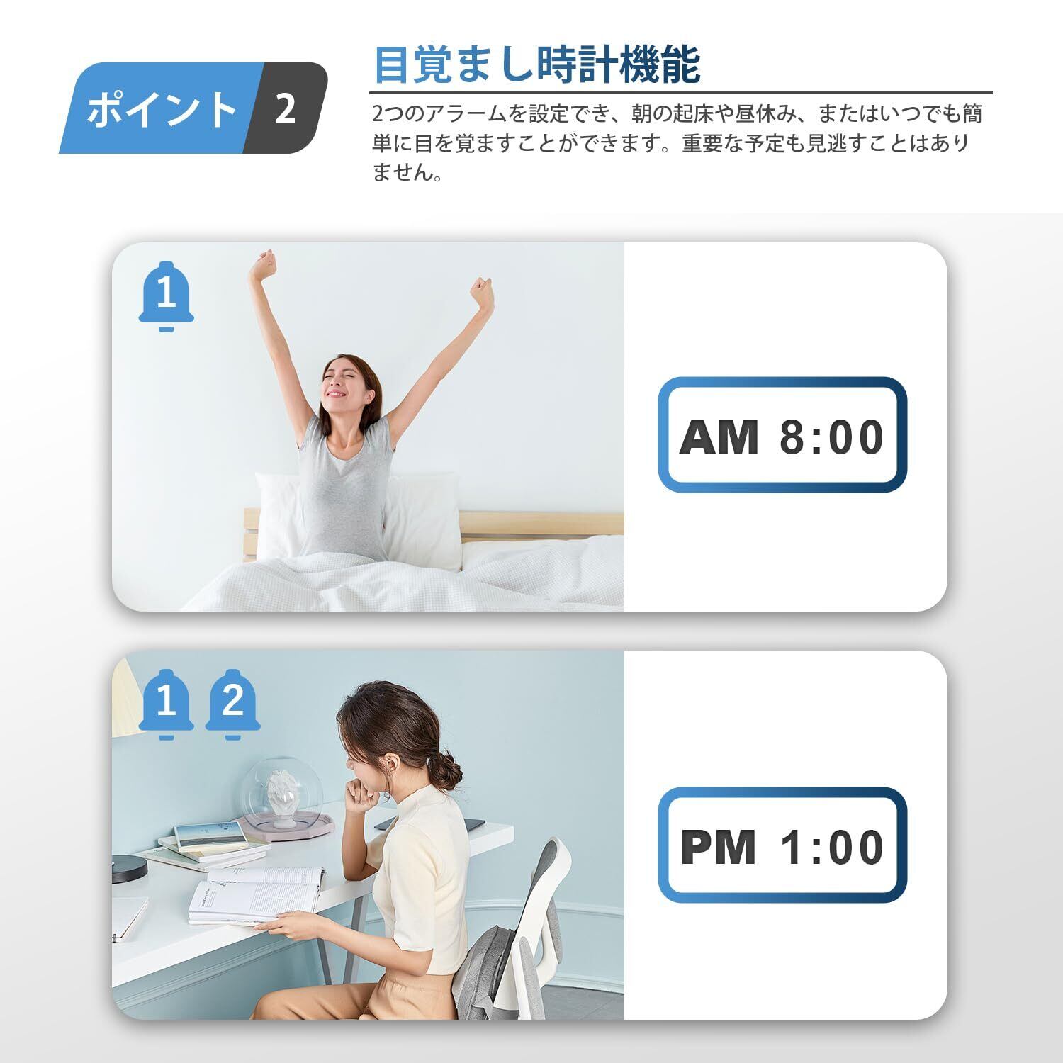 Revidayのデジタル目覚まし時計は、2組のアラーム機能を備え、平日と週末で異なる時間設定が可能です。忙しい朝のスタートを快適にし、あなたの生活スタイルに寄り添った時間管理をサポートします。