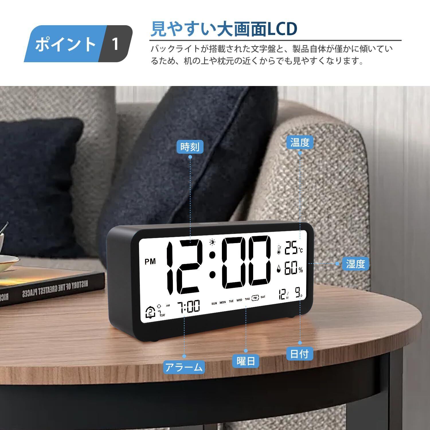 【大画面LCD】大画面LCDディスプレイを搭載しているため、情報が簡単に読み取れ、使いやすさが向上します。時刻、日付、曜日、温度、湿度、アラームなど、すべてが一目瞭然です。ベッドサイドやデスク上などに置くことで、より大きな時刻表示が可能で、常に現在の時間を把握できます。