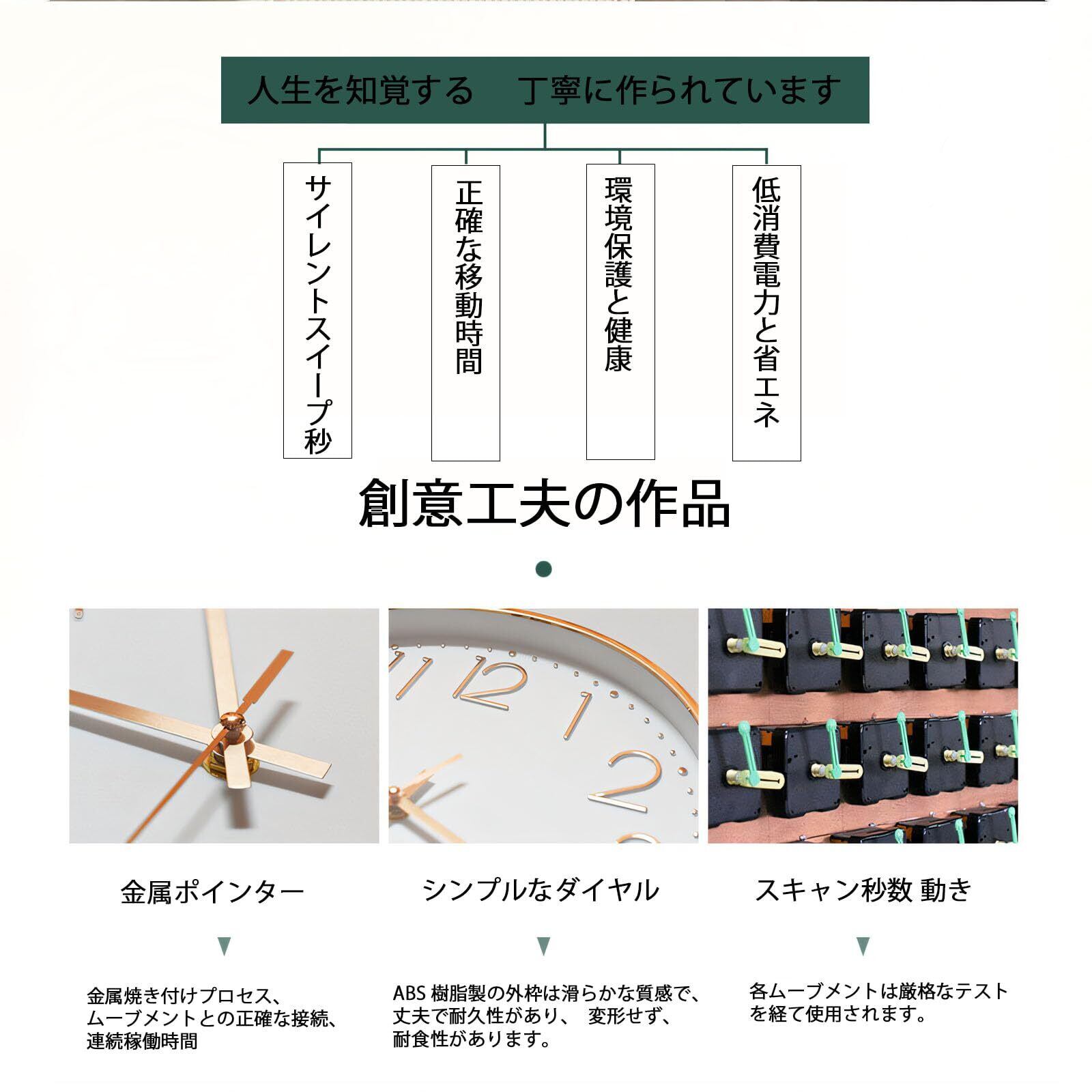 特徴:静音設計、連続秒針、大数字表示、北欧デザイン、インテリアアイテムにも最適