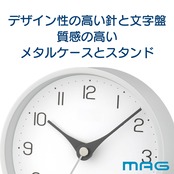 MAGの置き時計は、シンプルながらもおしゃれなホワイトのデザインが魅力です。直径11.2㎝のコンパクトなサイズ感が特徴で、卓上や窓辺、ベッドサイドなど、さまざまな場所に気軽に置けるアイテムです。インテリアに優しく馴染むデザインで、どんな空間にもすっと溶け込みます。