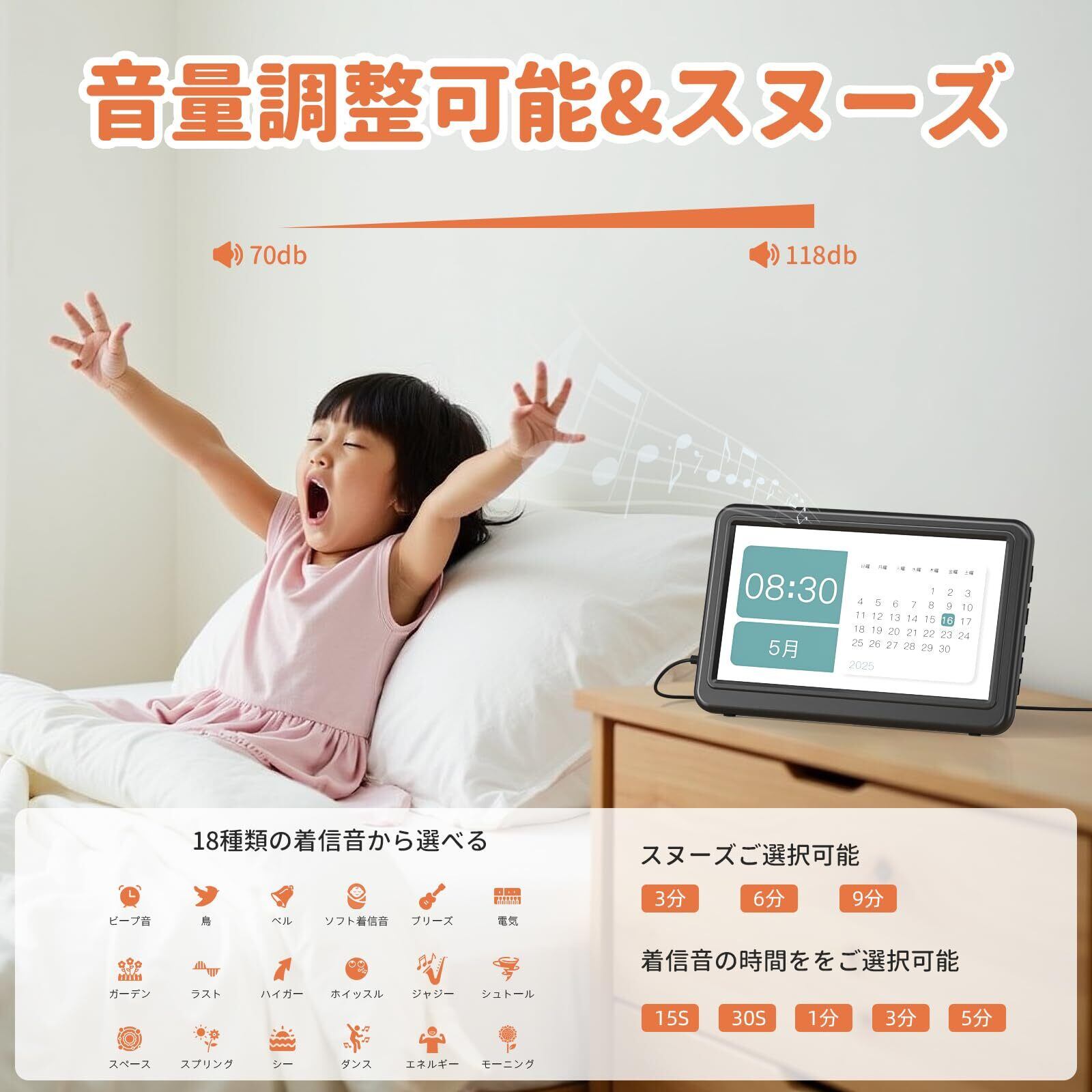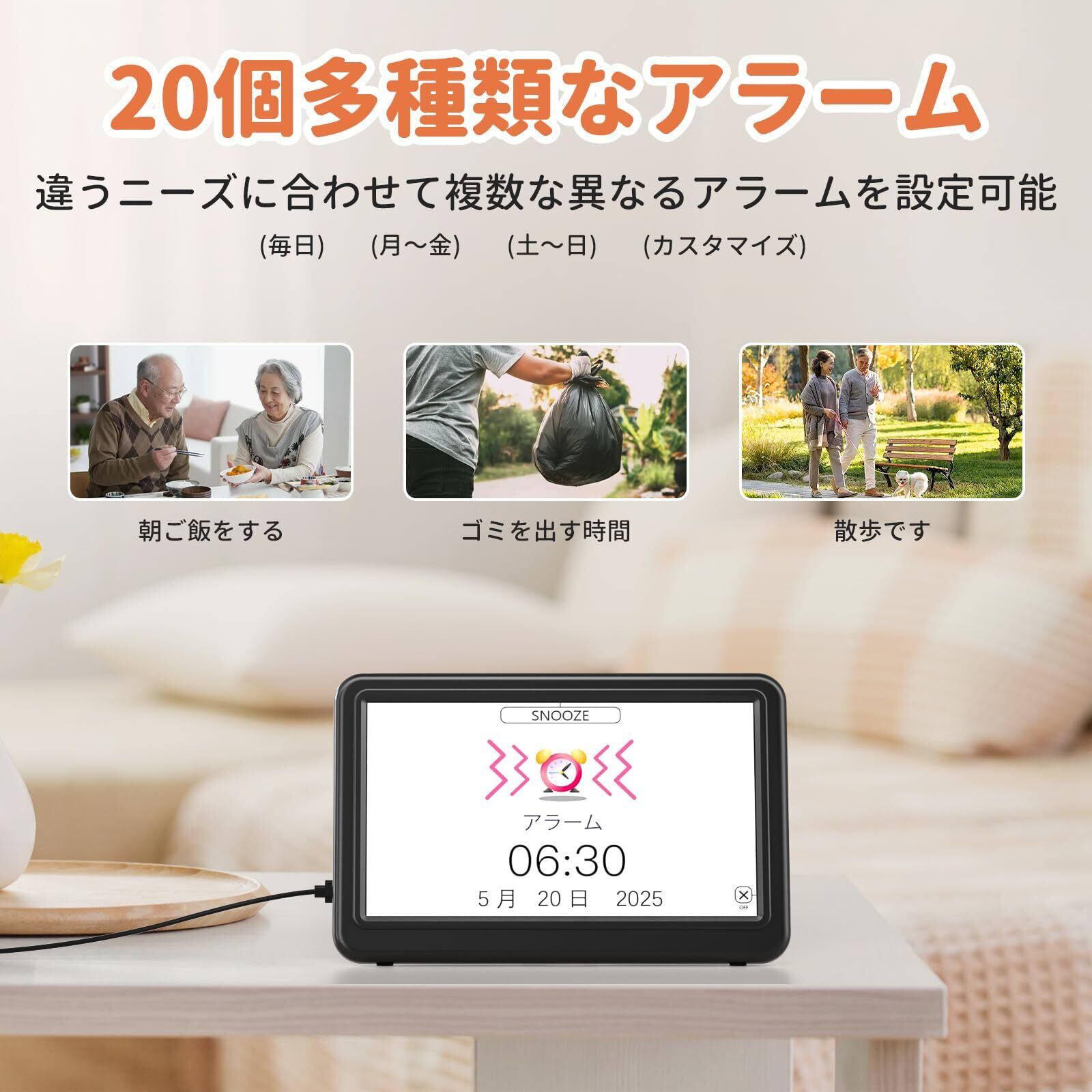 【7インチ大型画面で明瞭な情報表示】7インチの大型画面を備え、日付や曜日、時刻等の情報を大きく明瞭に表示します。高齢者や視力に不安のある方でも、遠くからでも簡単に視認できます。タッチパネル式ではないため、誤操作を心配することなく、安心して使えます。画面の文字は大きく、見やすさに配慮されており、日常生活のスケジュール管理や時間確認に最適です。