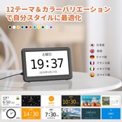 【12テーマ&多色カラー選択可能】従来の白黒表示時計と異なり、12種類のデザインテーマと複数カラーオプションを搭載する。学生・視覚障害者・色覚特性のある高齢者まで、室内の雰囲気や使用者の好みに合わせて表示スタイルを自由にカスタマイズ可能です。