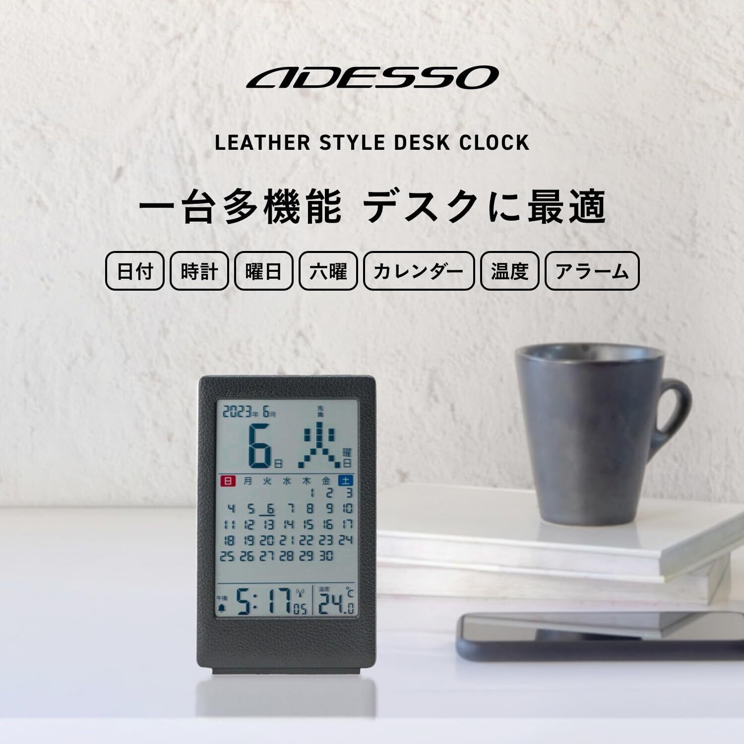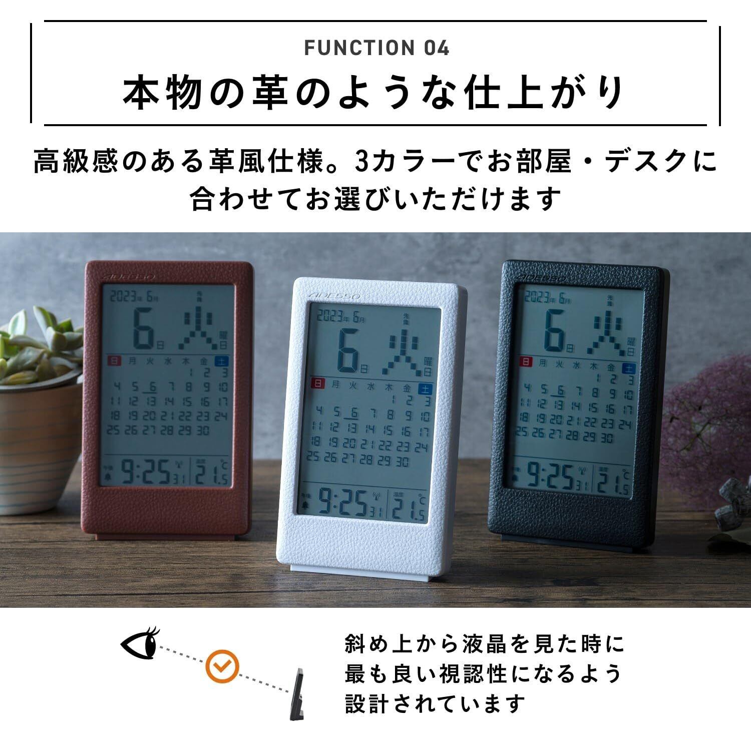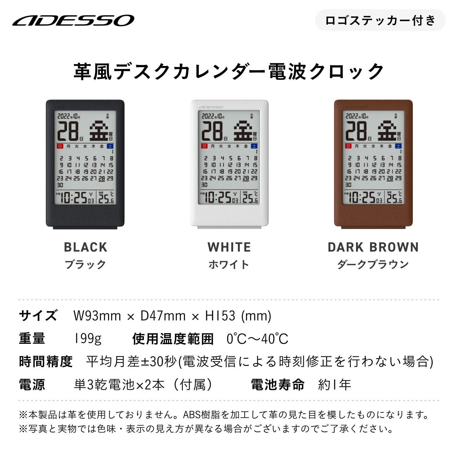 ADESSO(アデッソ) 電波時計 カレンダー 温度計 アラーム 目覚まし コンパクト 多機能 見やすい シンプル 革風 正確 置き時計 デジタル 卓上 オフィス 書斎 学校 寝室 ホワイト 非売品ステッカー付属