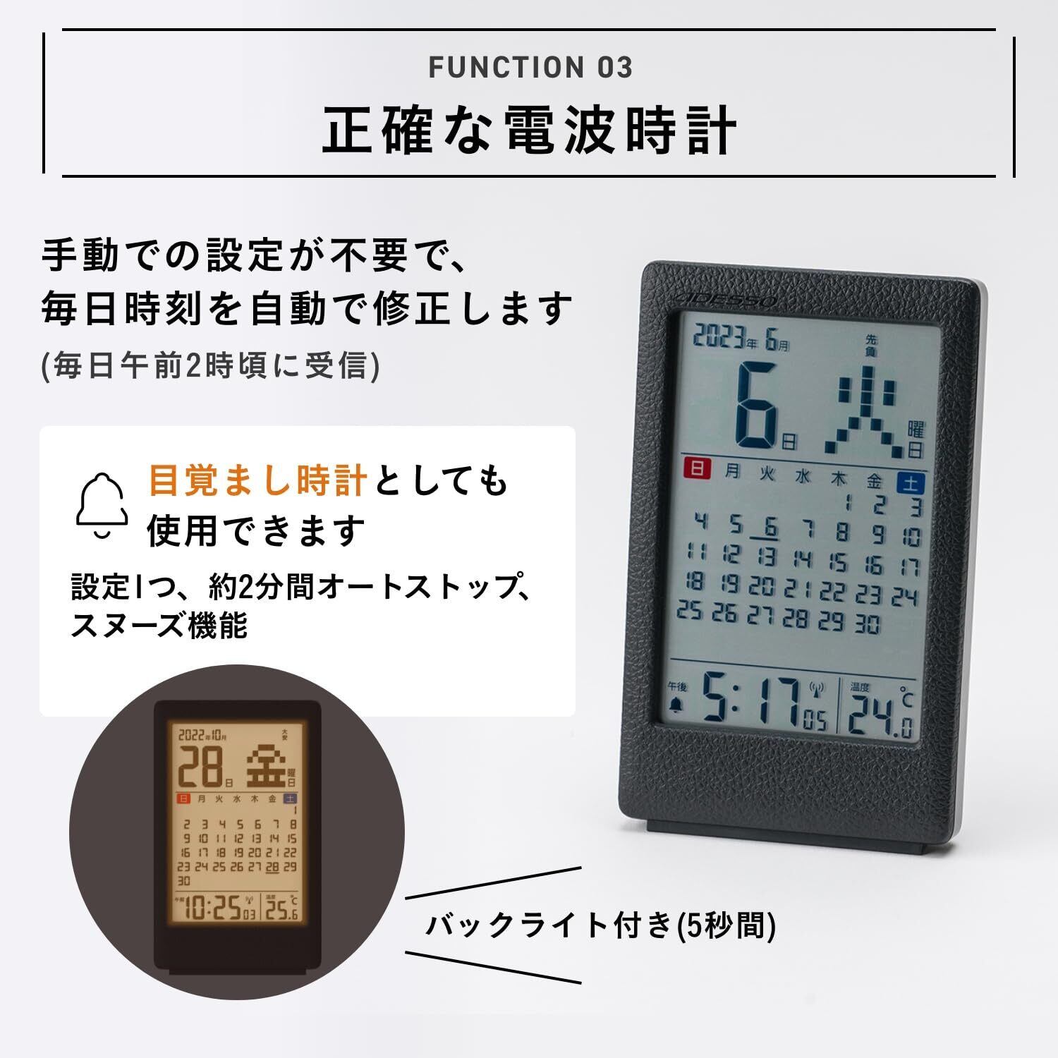 【正確な電波時計】手動の設定は不要。毎日時刻を自動で受信し、正確な時刻を表示してくれます。