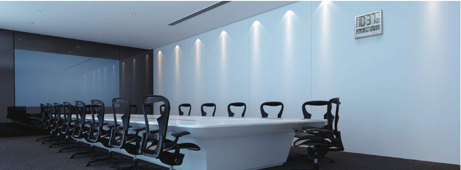縦およそ30cm、横40cmの大型サイズにも関わらず、厚さわずか2.4cmの壁にぴったりフィットする見やすい電波時計です。 カラーリングも明るいシルバーにまとめました。