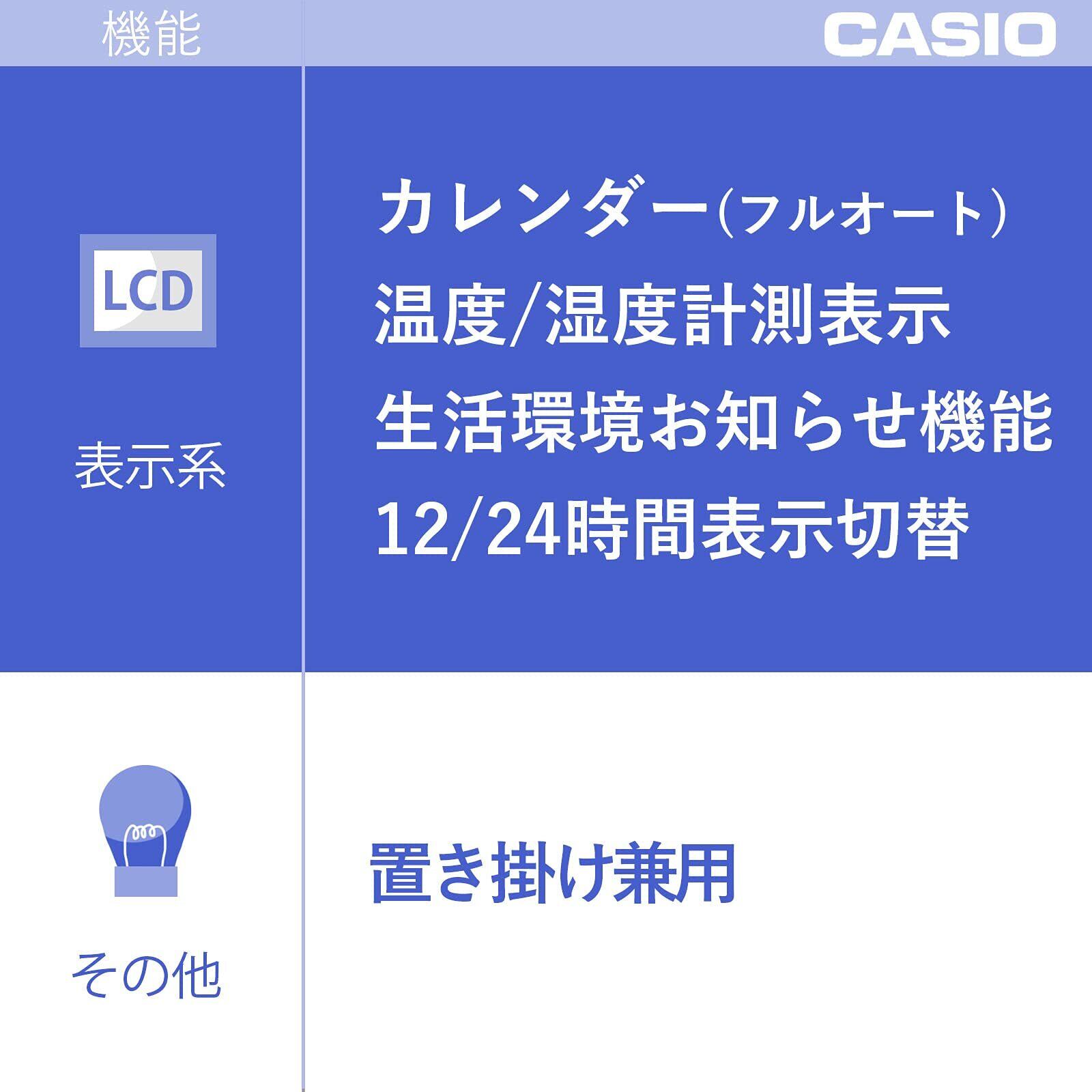 機能:電波受信機能(自動受信/手動受信)、電波受信ONOFF機能、温度表示、湿度表示、生活環境お知らせ機能(アイコン表示)、カレンダー表示、12/24時間制表示切替、置き掛け兼用