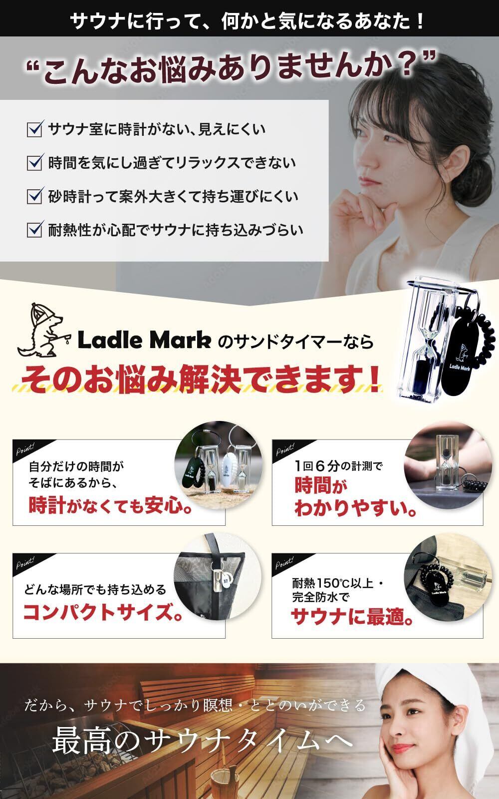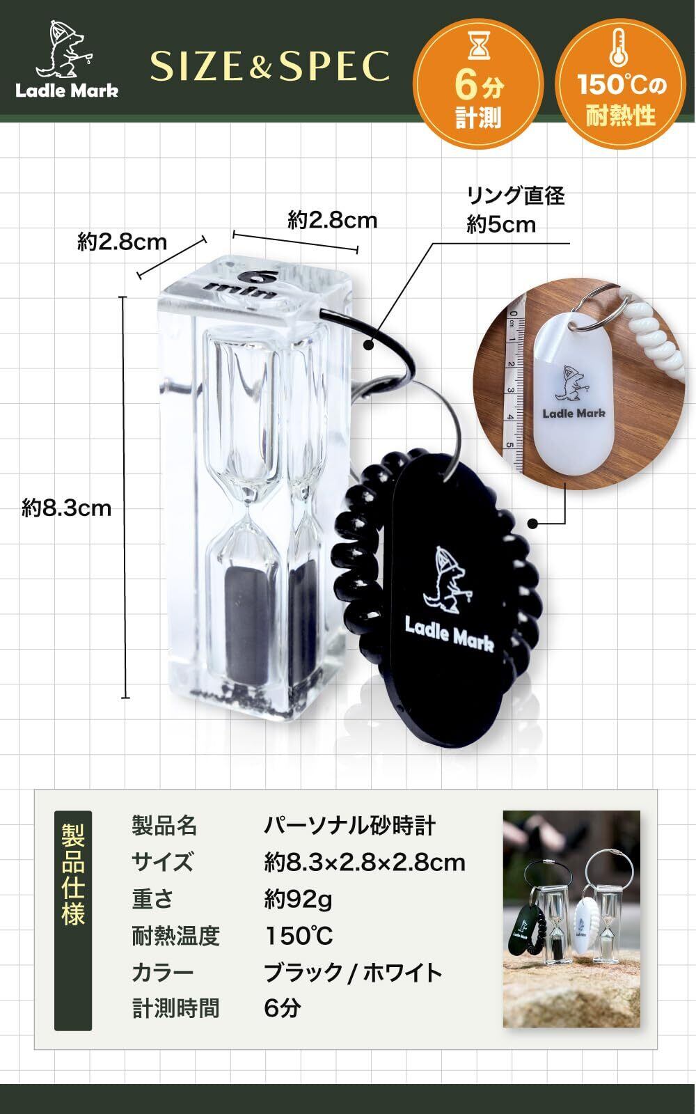 「Ladle Mark」のハイロサンドタイマーは、6分計と12分計の両方を備えたデザインで、忙しい日常の中でもリラックスするための大切な時間を管理できます。サウナや水風呂での快適な時間をサポートするために設計されていますので、安心してご利用いただけます。