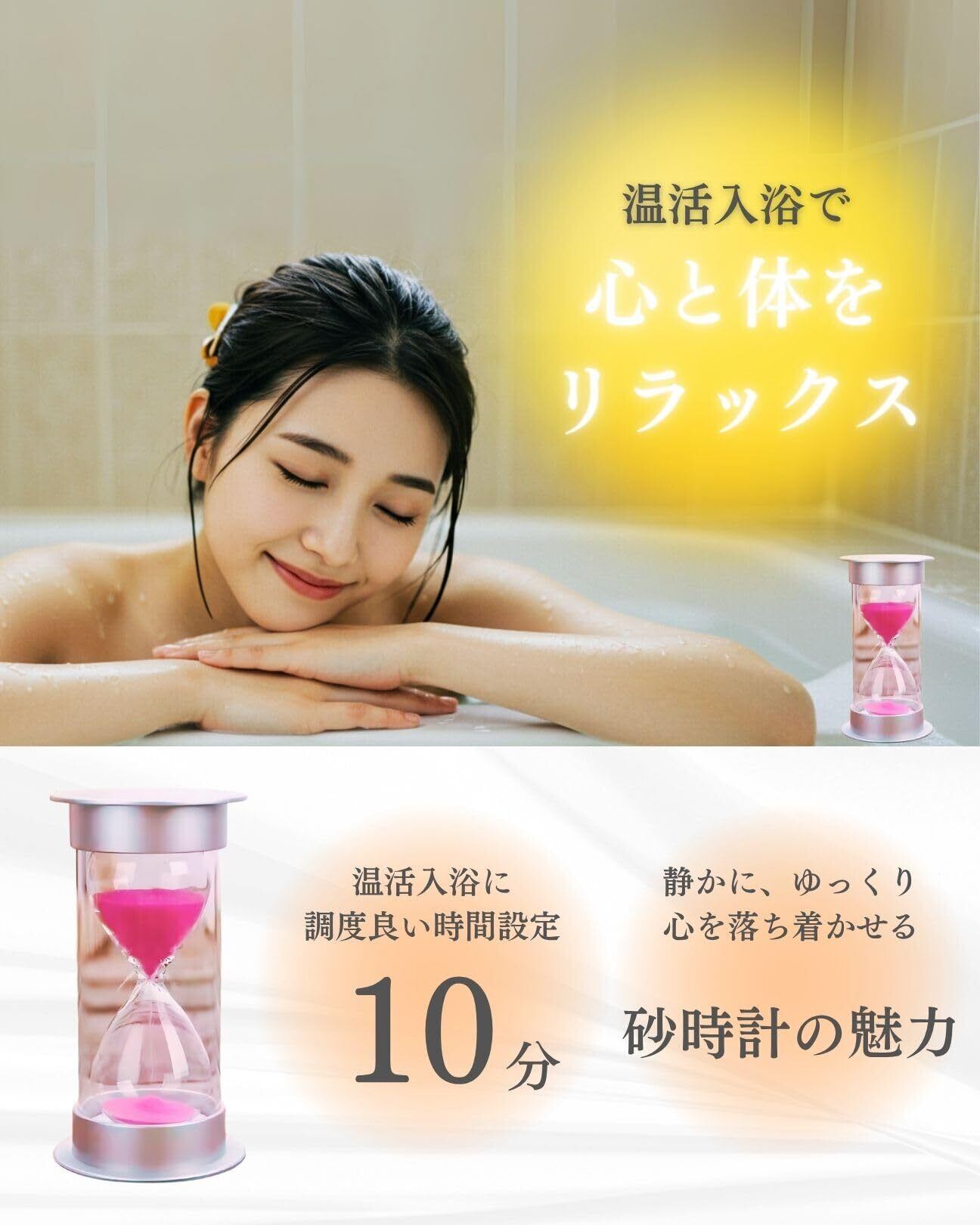 湯ったりタイマーは、最適な入浴時間を計るのにぴったりな10分計砂時計です。これを使うことで、心地よい入浴タイムを正確に管理し、ゆったりとしたリラックス時間を実現します。快適な入浴をサポートし、身体と心の両方をリフレッシュさせます。