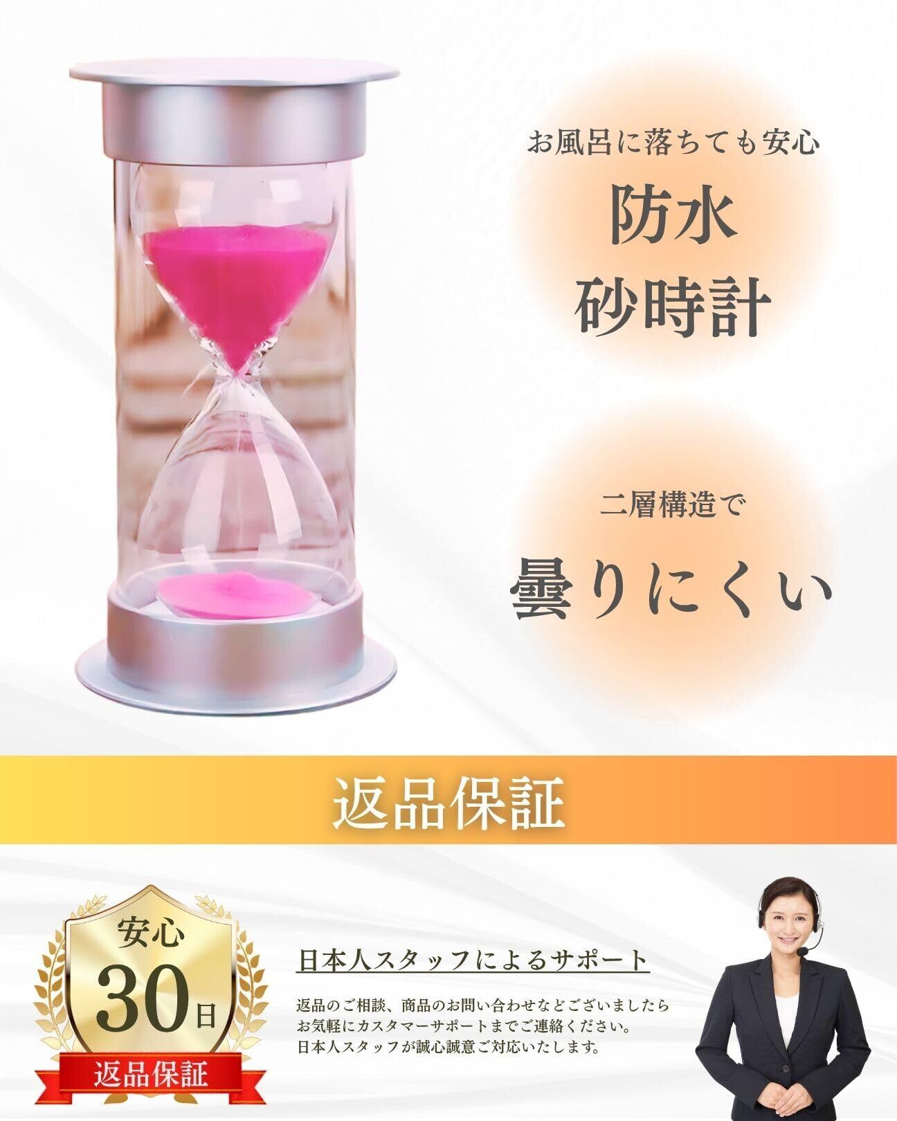 この砂時計は防水機能を備えており、浴室内でも安心して使用できます。また、二層構造により、くもりにくく、いつでも正確に時間を確認できるのが嬉しいポイントです。お風呂やサウナでも、快適に使用できる設計となっています。