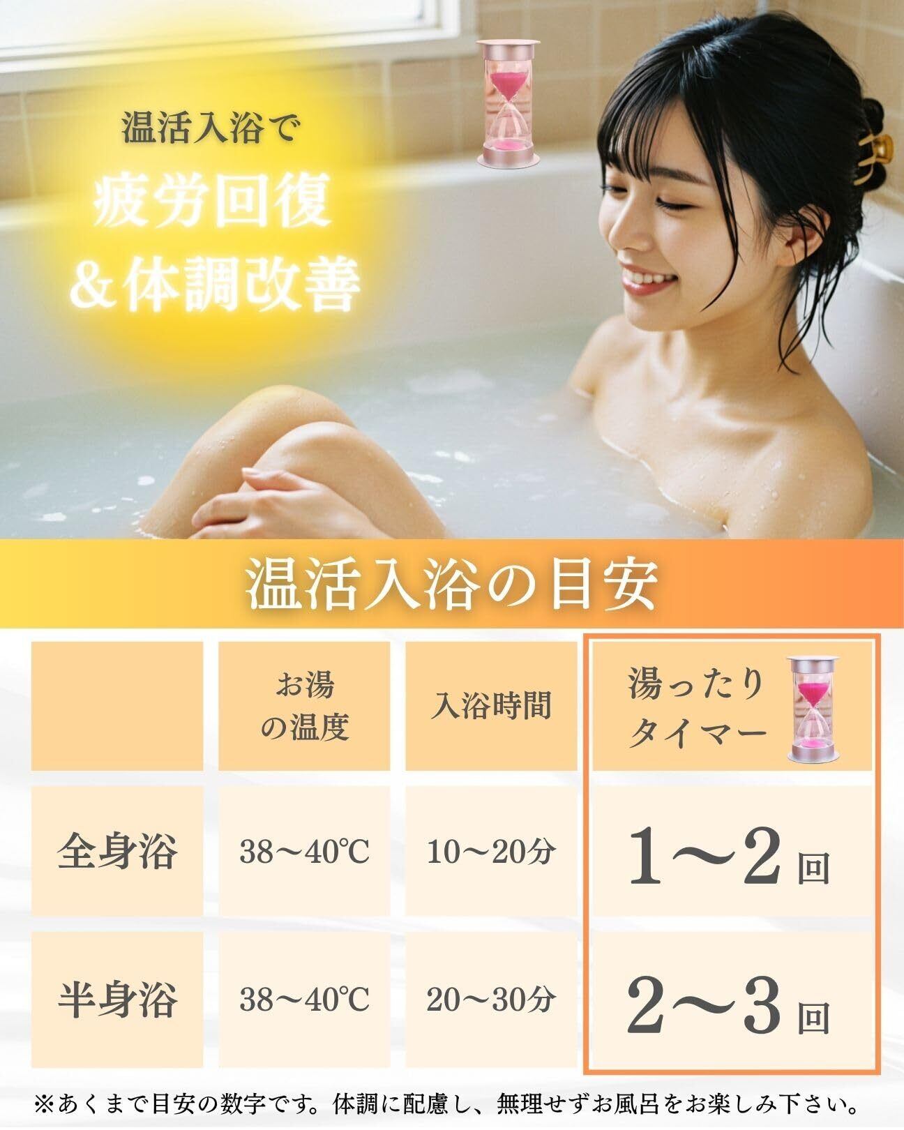 ️【温活入浴にオススメな10分設定】効果的な温活入浴の目安はお湯の温度が38〜40℃、入浴時間が全身浴で10〜20分、半身浴で20〜30分となります。「湯ったりタイマー」は温活入浴の時間計測に最適な10分設定です。
