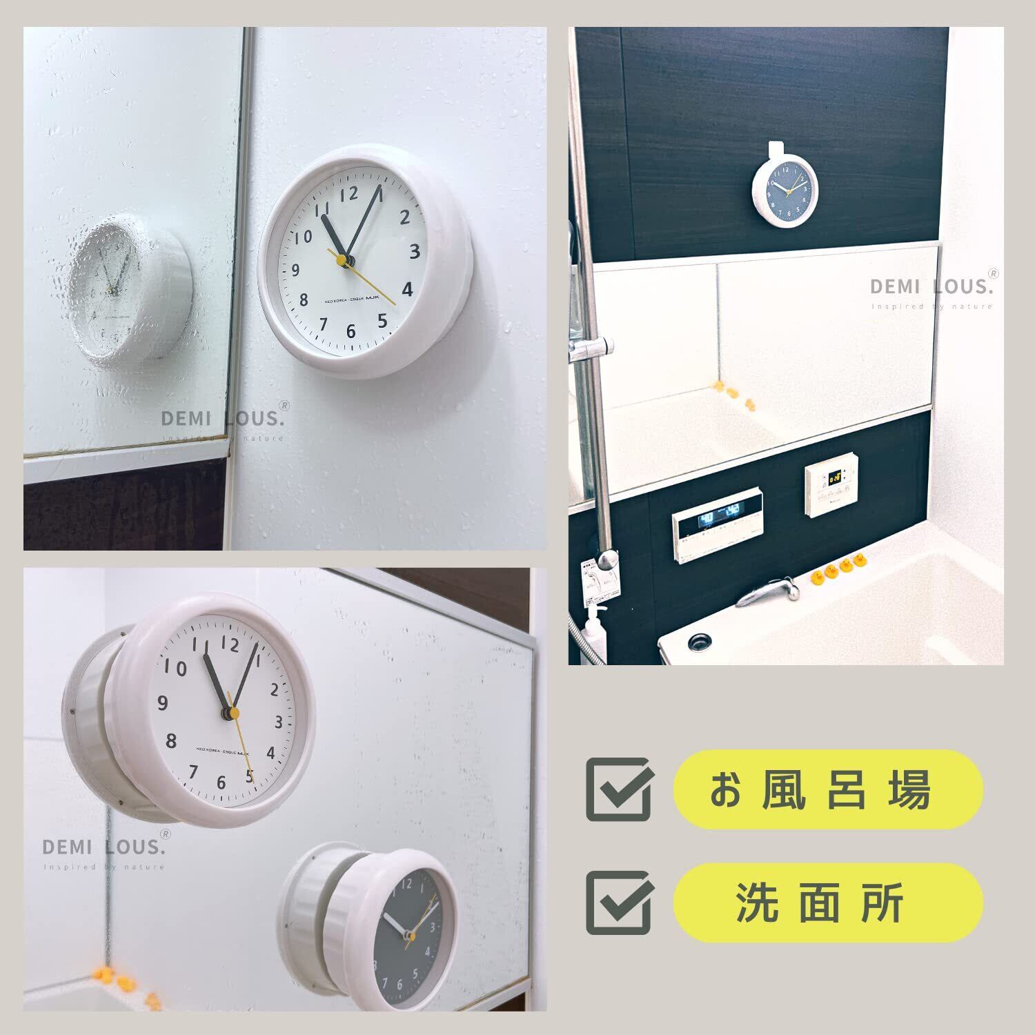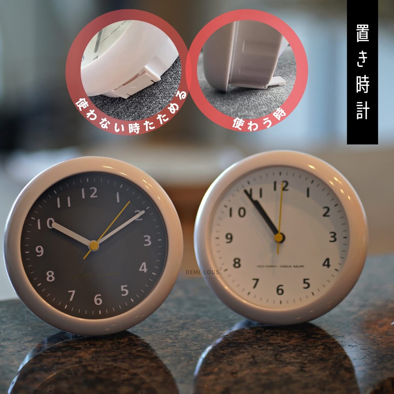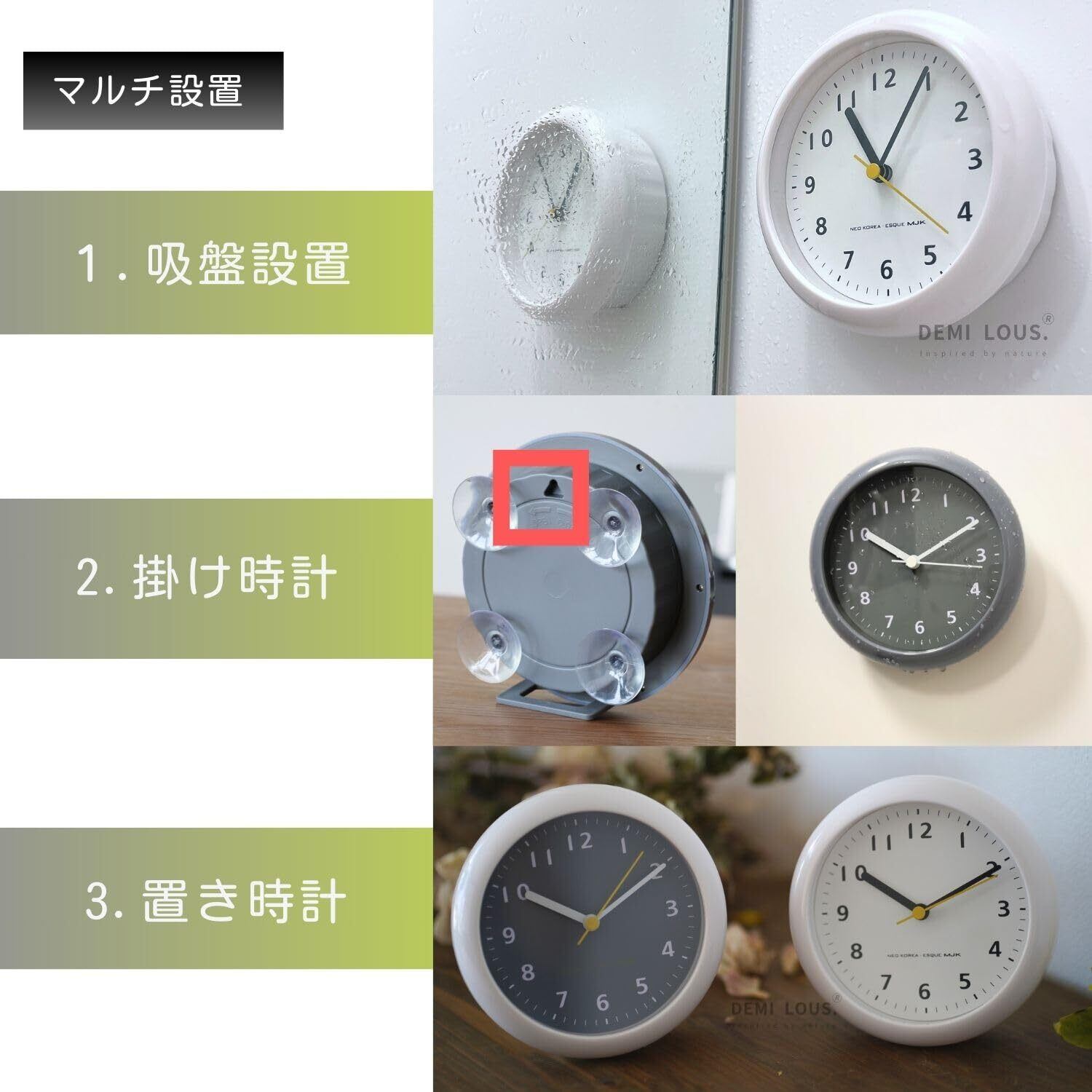 DEMI LOUS. 防水 風呂 時計 お風呂 防水時計 お風呂用 置時計 掛け時計 吸盤 兼用 3WAY ガラスに付く 吸盤付き クロック 温泉時計 簡単設置 洗面台 電池式 静音ムーブメント 置き方自在 掛け用フック 置き用スタンド 直径16cm 手ごろなサイズ (グレー)