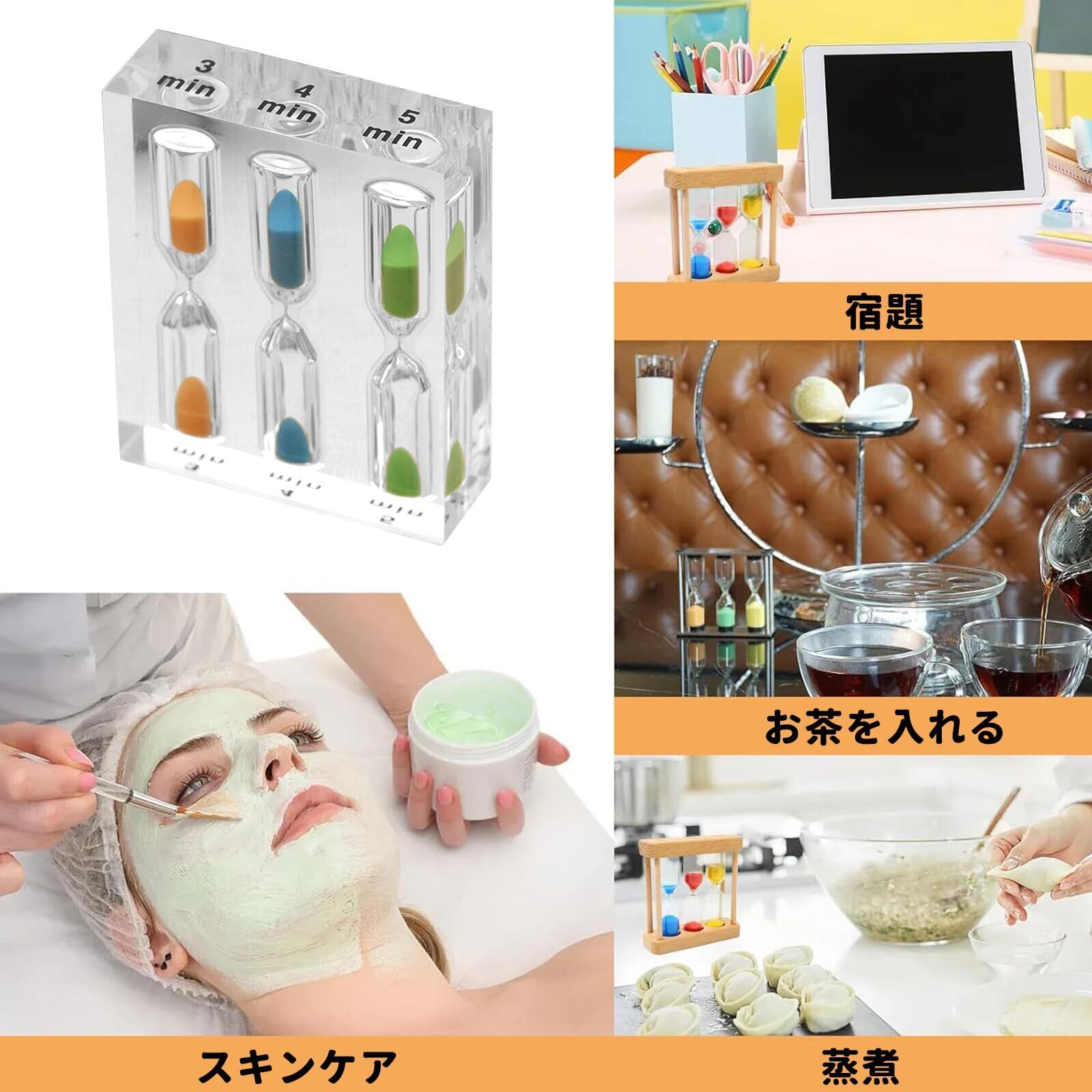 【商品内容】3/4/5分計の砂時計*1 カラー(砂):オレンジ+ ブルー+グリーン サイズ:7*8*2.5cm 材質:アクリル+海砂 時間:3分計/4分計/5分計