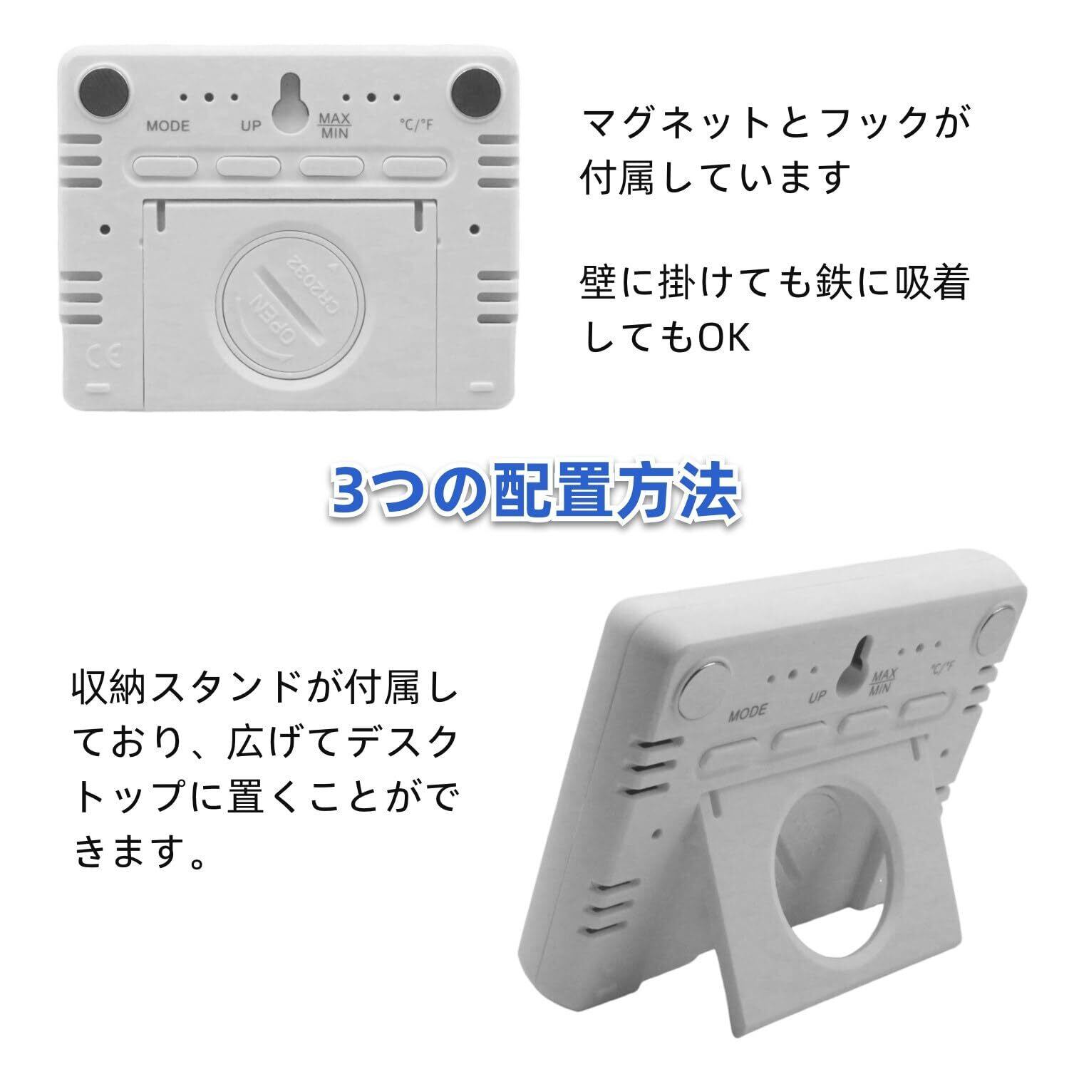 【複数の設置方法】デスクスタンド、磁石、金属粘着パッドで、リビングやキッチン、オフィスなどあらゆる場所に設置可能。温湿度を快適・高温・乾燥状態で表示する環境アイコンも搭載。