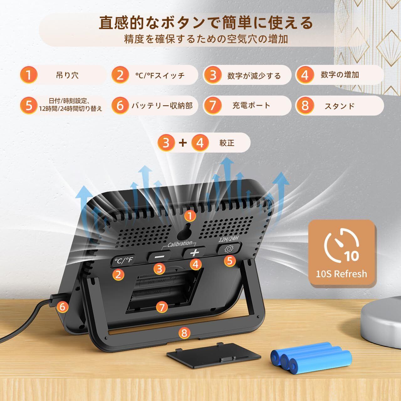 【日付と時計機能】日付と時計を備えた独自のデザインで、時刻を簡単に確認できます。単4電池3本が付属しているので、届いてすぐにお使いいただけます。同梱物:室内温度計、USB-Cケーブル、電池3本、ユーザーマニュアル。注:USB電源プラグは付属していません。5V電源プラグから電源を供給できます