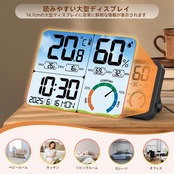 【14.7cmの大型ディスプレイ(バックライト付き)】14.7cm の大型 HD 液晶画面で、現在の温度・湿度に加え、快適度指標、1 日の最高・最低記録、時計、カレンダーを表示。バックアップ電池使用時は、画面上部をタッチするだけでバックライトが 30 秒点灯。見やすく省電力設計で、バックライト時も視認性向上。背面の簡易操作ボタンで手動設定や °F/°C 切り替えが可能です