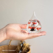 リトルミイのイラストが描かれた、しずく型のかわいらしいフォルム。同じくリトルミイをイメージした4つの赤いガラス球が浮き沈みします。
