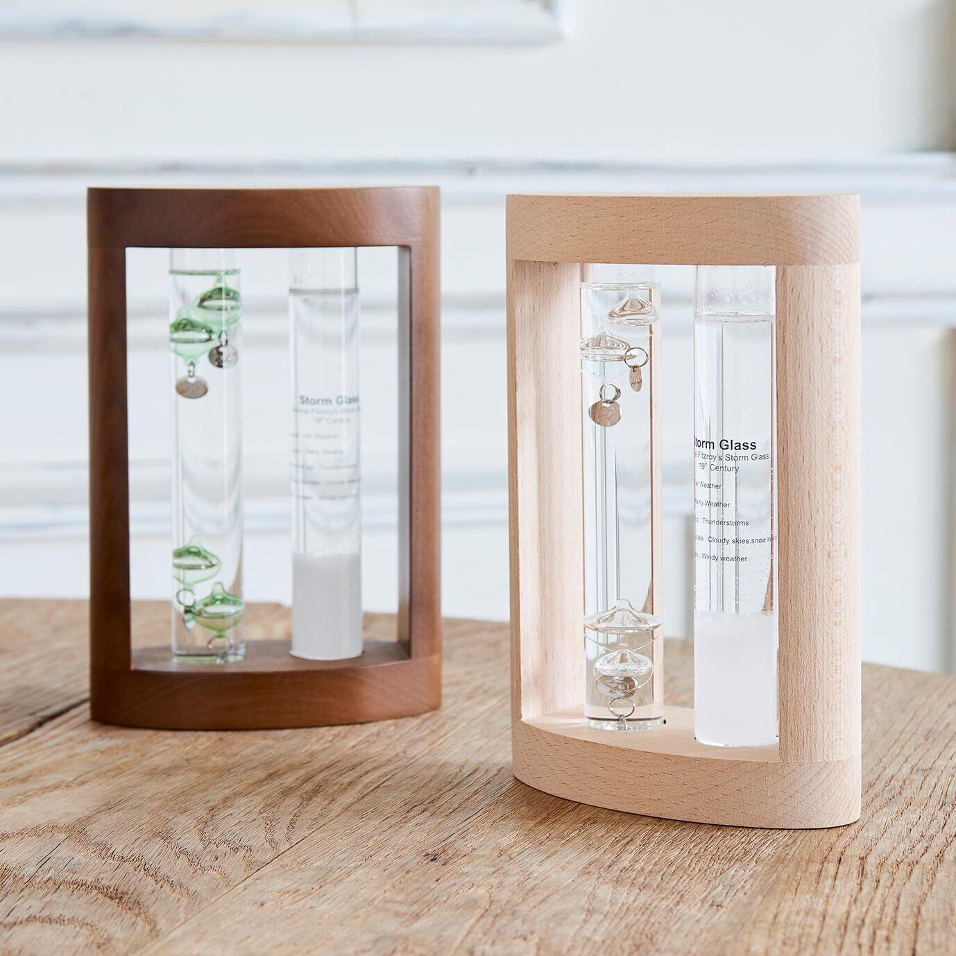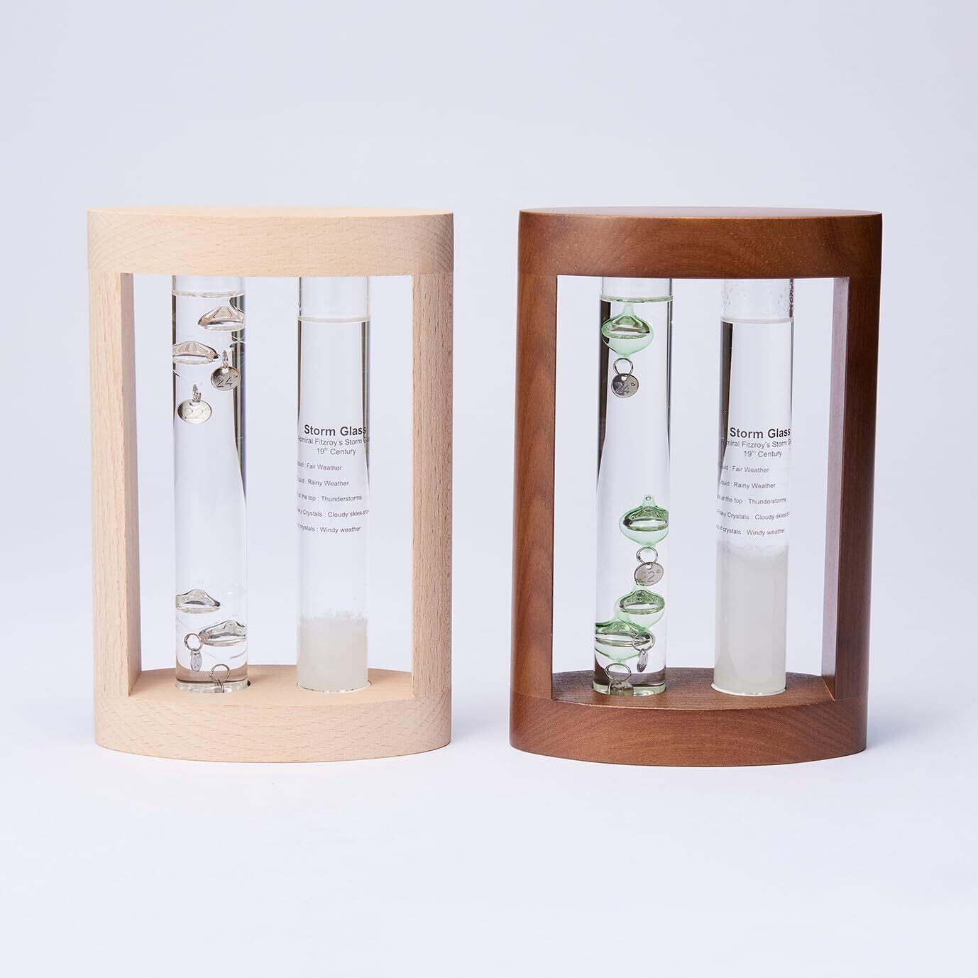 気温によってガラス球体が浮き沈みする「ガラスフロート温度計」、気象状況によって結晶の形が変化する 「ストームグラス」