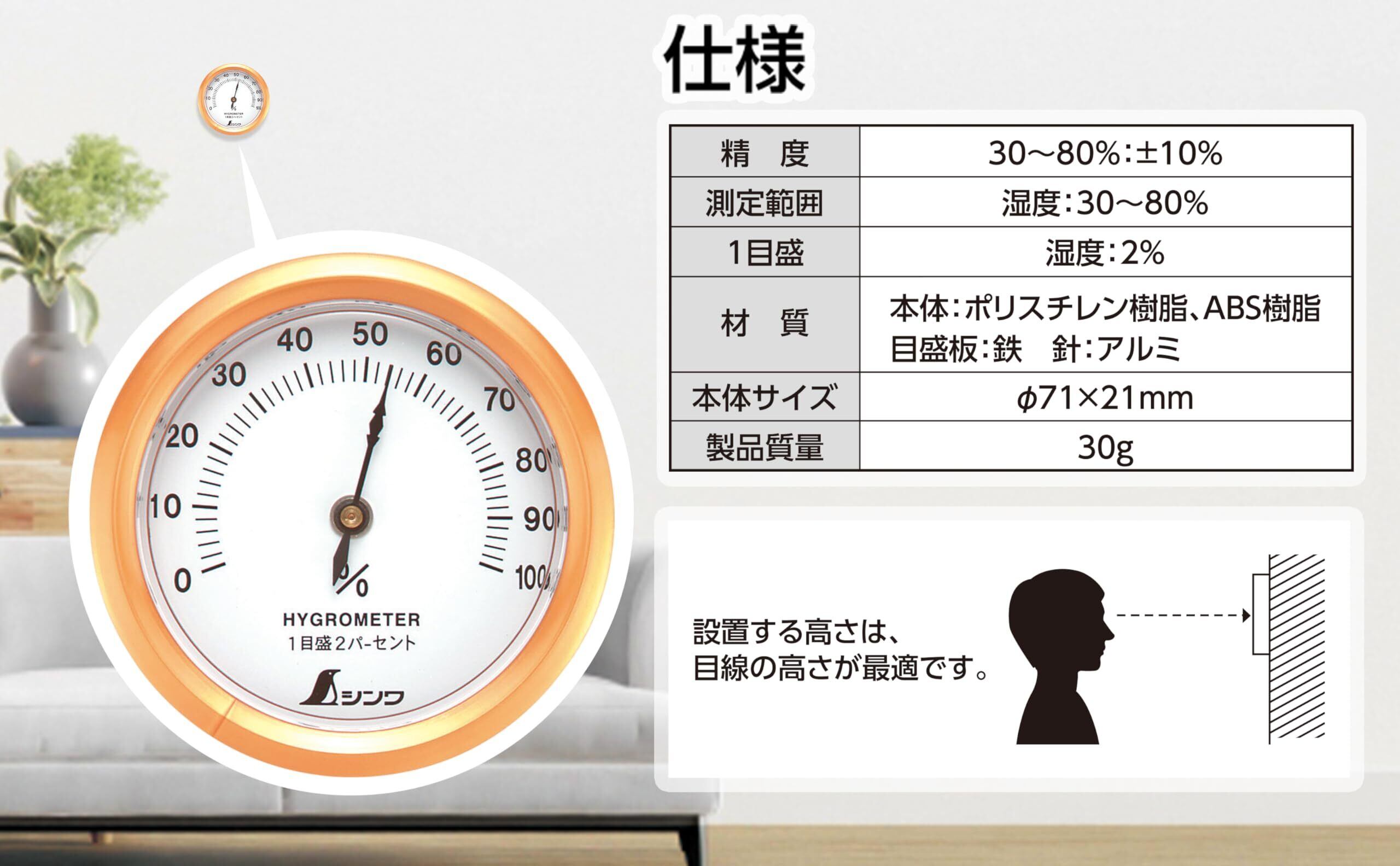 ●湿度の測定に使用する湿度計。 ●健康管理や省エネに役立ちます。 ●一目でわかりやすい白文字板を採用しています。