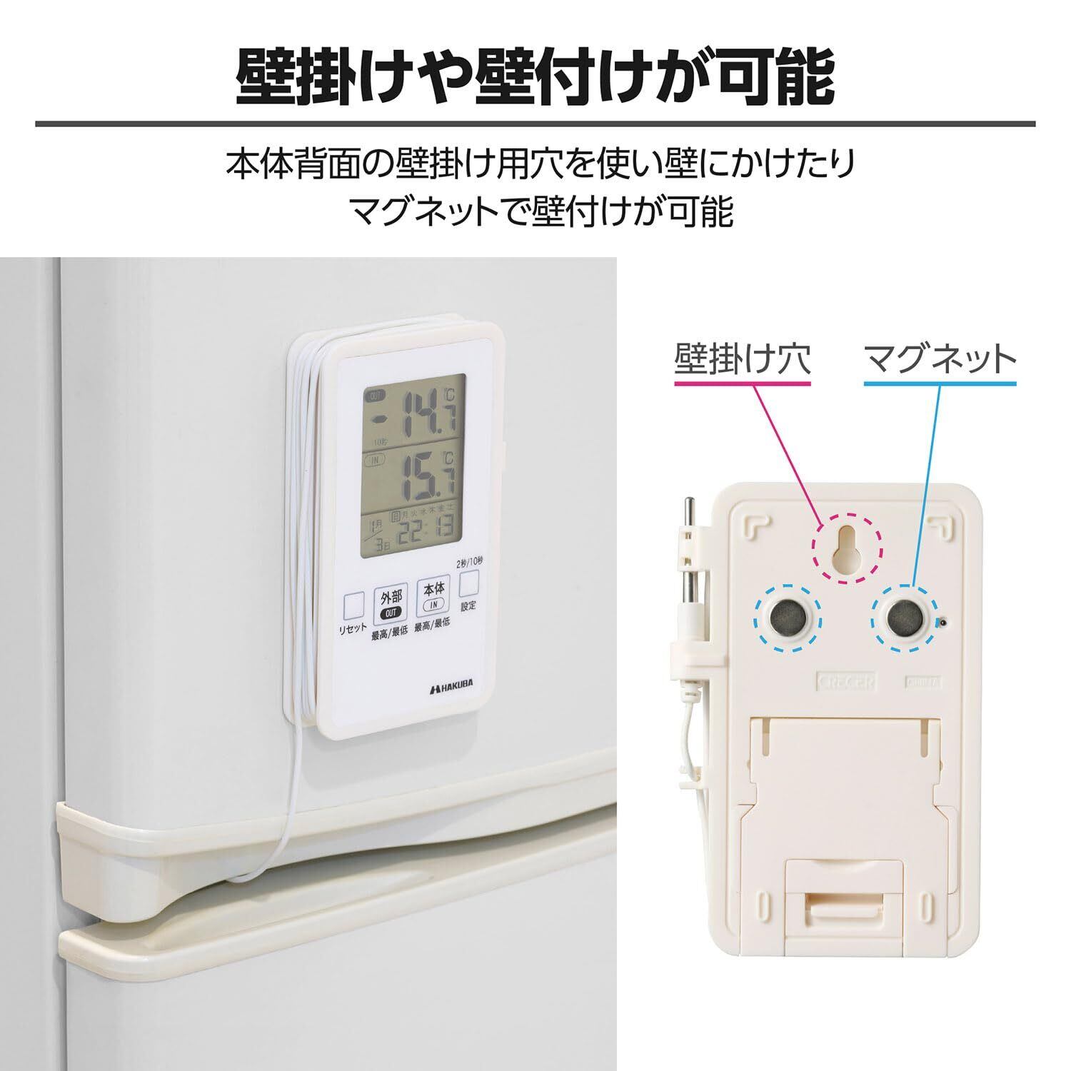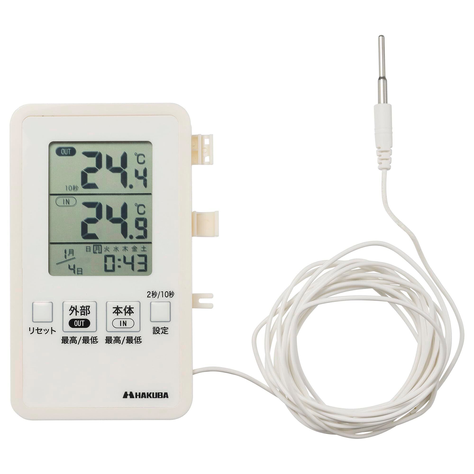 外部センサーと本体の2ヵ所の温度を独自に計測可能なデジタル内外温度計