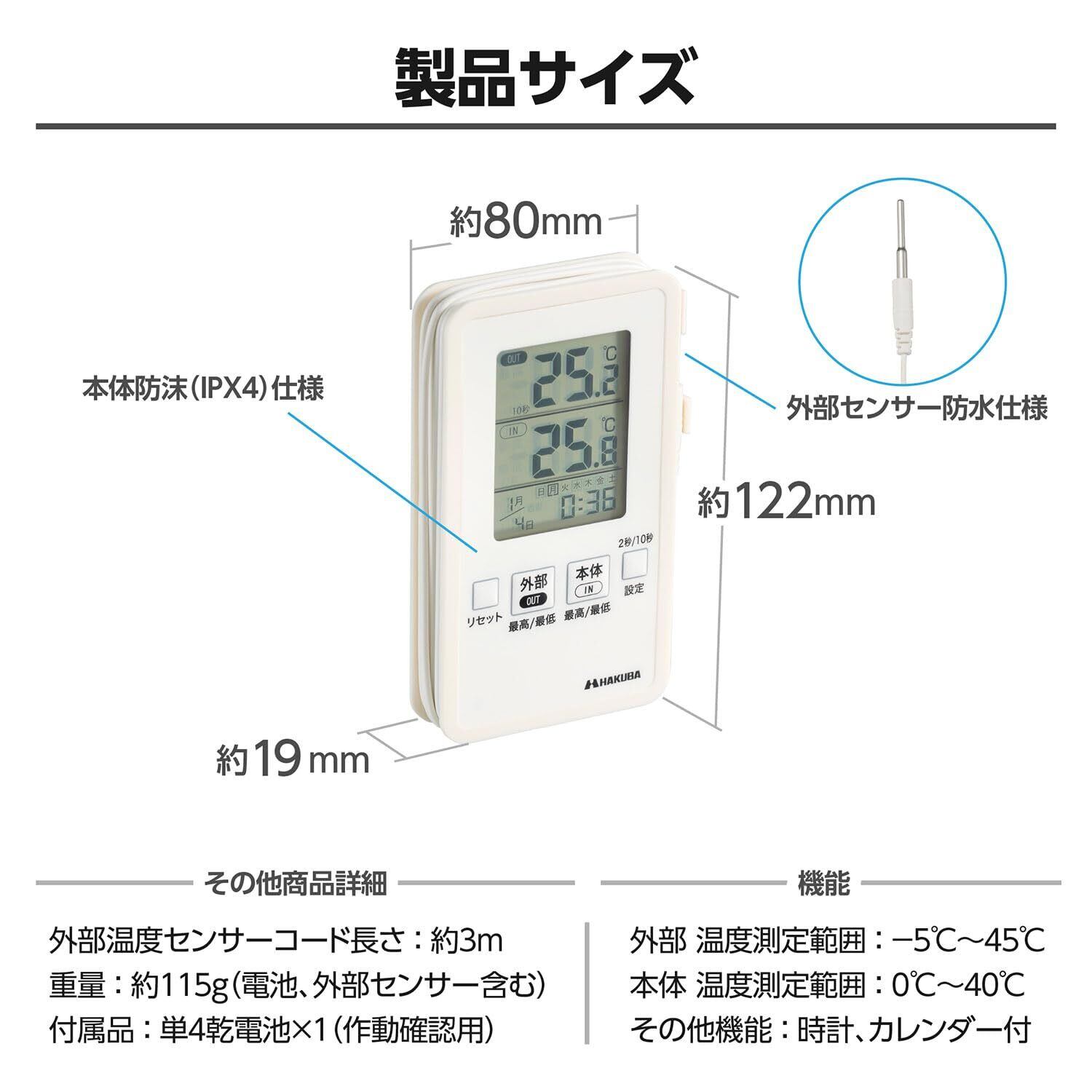 サイズ:W80×H122×D19mm 重さ:115g、温度測定範囲:外部センサー温度:-20℃~70℃、本体センサー温度:-10℃~50℃、コードの長さ:約3m