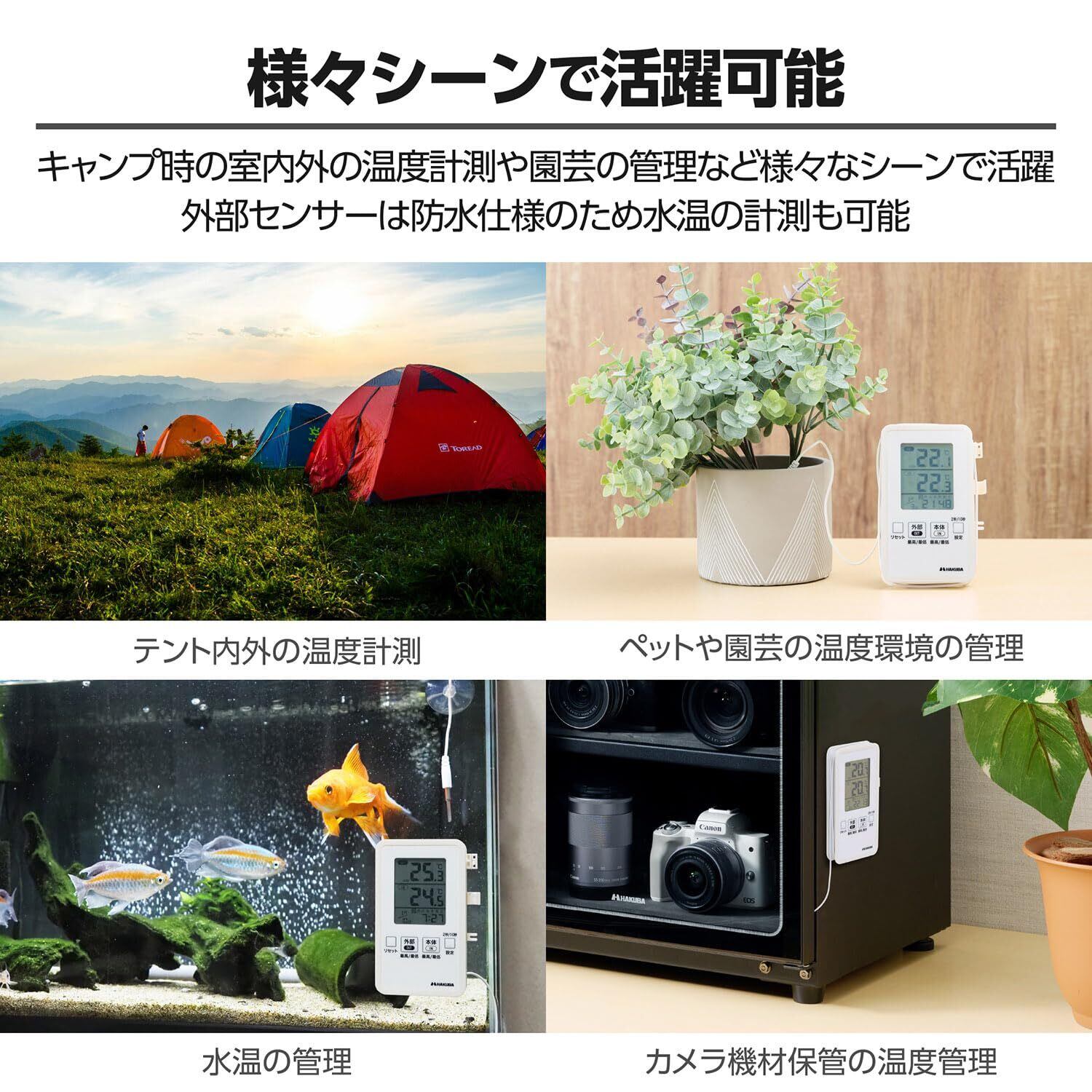 キャンプ時のテント内外の温度や、ペット・園芸の温度管理など様々なシーンで活躍。外部センサーは防水仕様なので水温の計測も可能。(本体センサーはIPX4仕様)