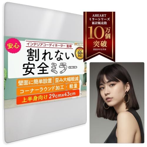 【基本仕様】 アクリル製で軽量・割れにくく、万が一落下しても飛散しません。 また、角を丸くカットしているため、キッズスペースや赤ちゃんのいる場所でも安心してご使用いただけます。 玄関の確認用ミラー、姿見、クローゼットミラーなど、さまざまな場所で活躍します。 AHEARTのミラーは、専門家によるW監修のもと開発された「どこでも貼れる・割れにくい理想のミラー」です。 ※浴室でのご使用は不可となっております。