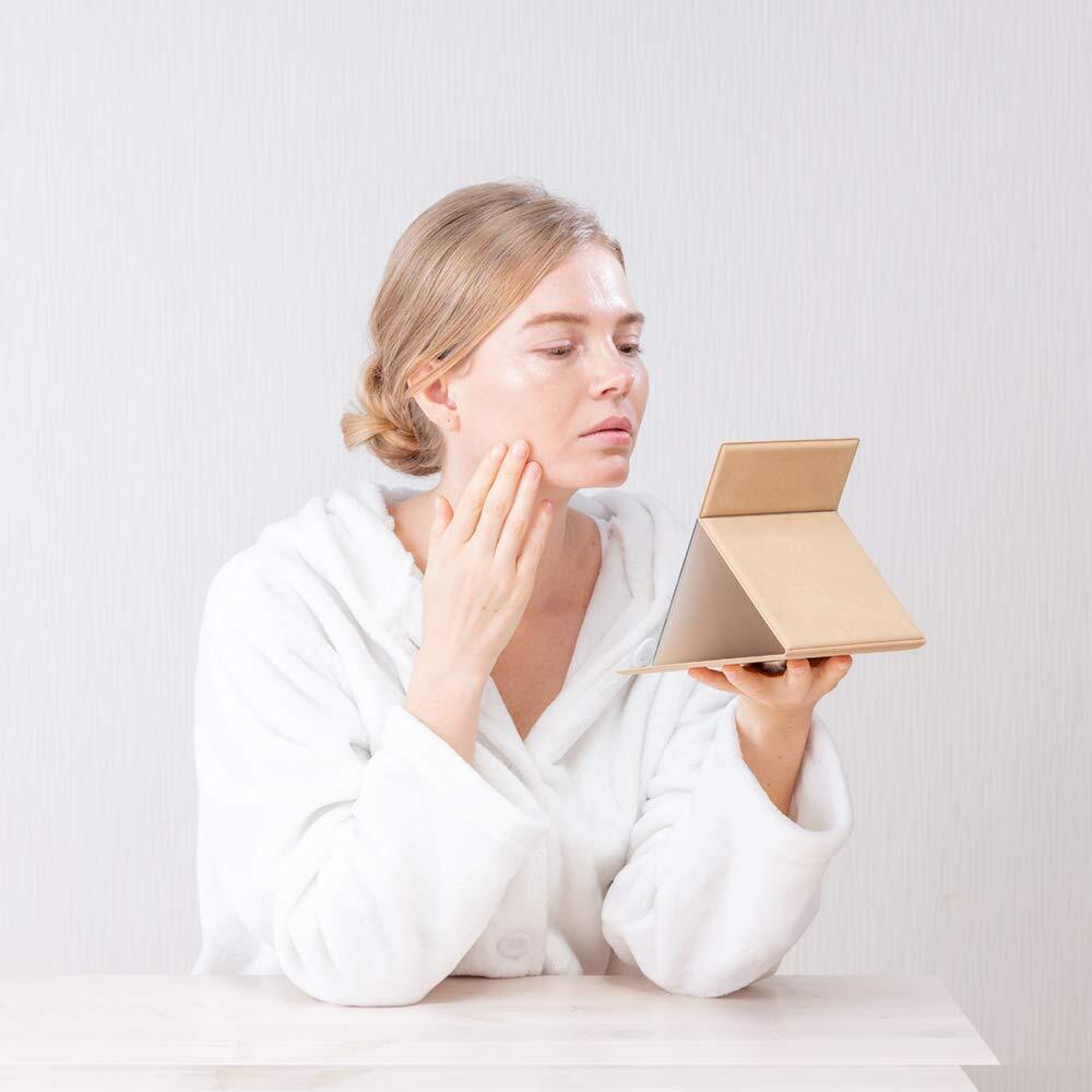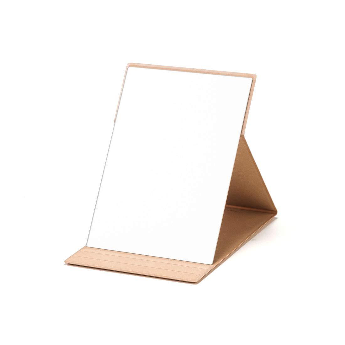 【軽量コンパクト・角度調整可能】自由な角度に鏡を調整できるように、本体生地に滑りにくい素材を使っています。さらに最大角度に傾斜させる際はロックラインも入っていますので、ずり落ちることがありません。従来の折りたたみミラー(当社比)よりも薄く軽いので、場所をとらずコンパクトに収納でき、引き出しやバッグに入れても邪魔になりません。旅行やお出かけ時など持ち運びに便利です。B6サイズの手帳と同じサイズ感で、バックに入れてもかさばらず、外出先でのメイク直しに便利です。サイズ12.5cm×17.3cm、厚み0.85cm、重量約200g