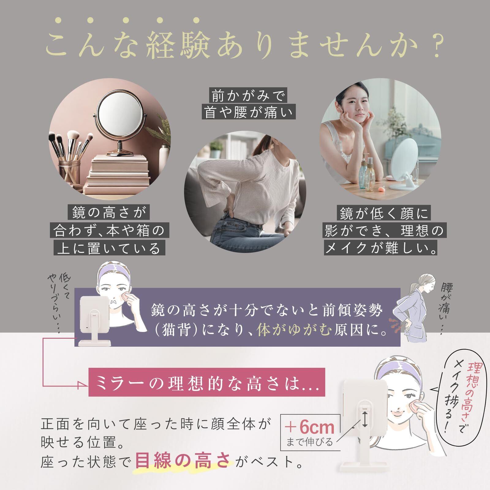 【高さ調節可能】ミラーの高さが合わずに腰や首が痛い。前傾姿勢で顔に影ができ、メイクにムラがでる。こんなお悩みを解決できます。