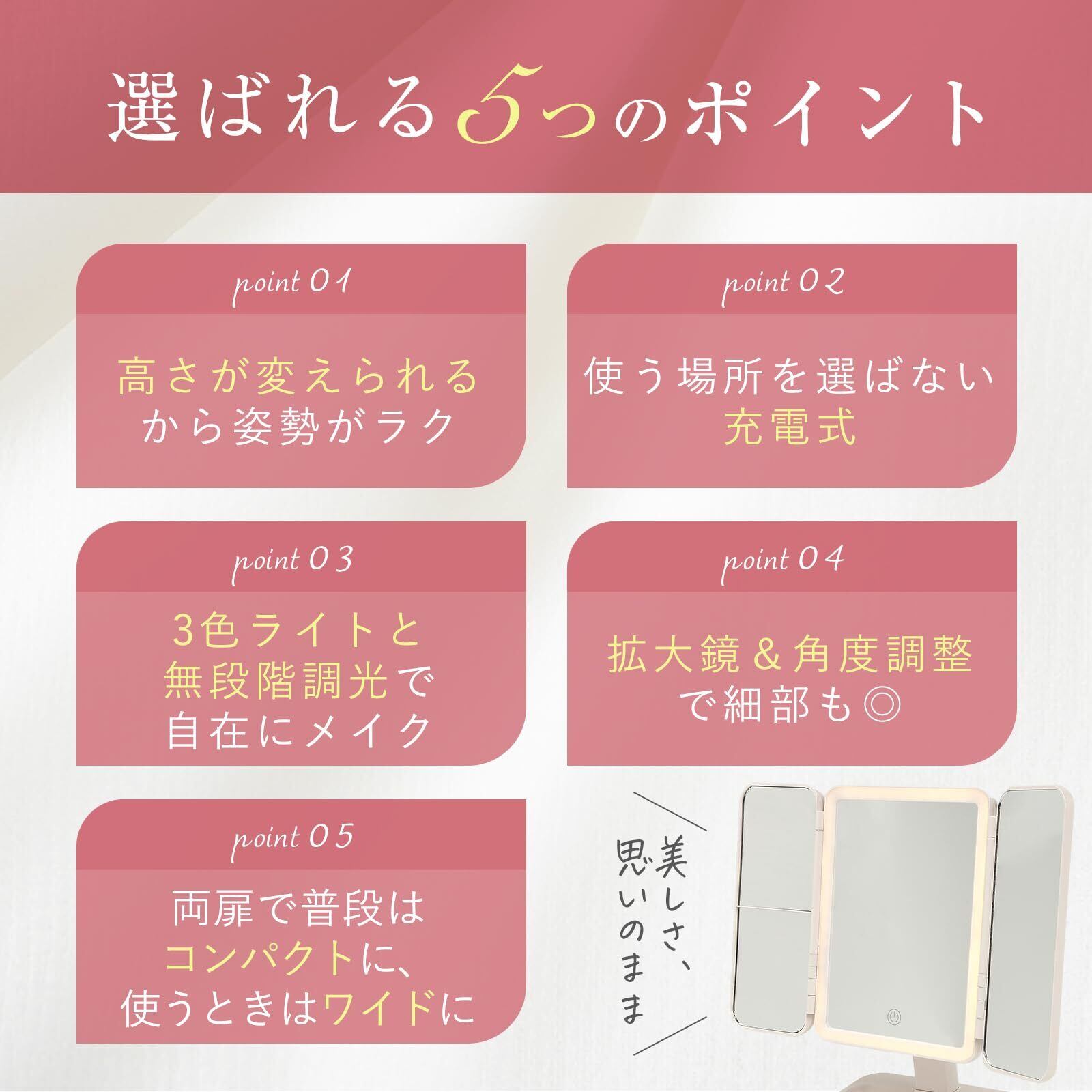 Venus Style 天使の鏡 女優ミラー 【高さ調整可能】 光量・バッテリー容量UP/3色LED 無段階調光 充電可 拡大鏡 化粧鏡 卓上ミラー LED ライト付き