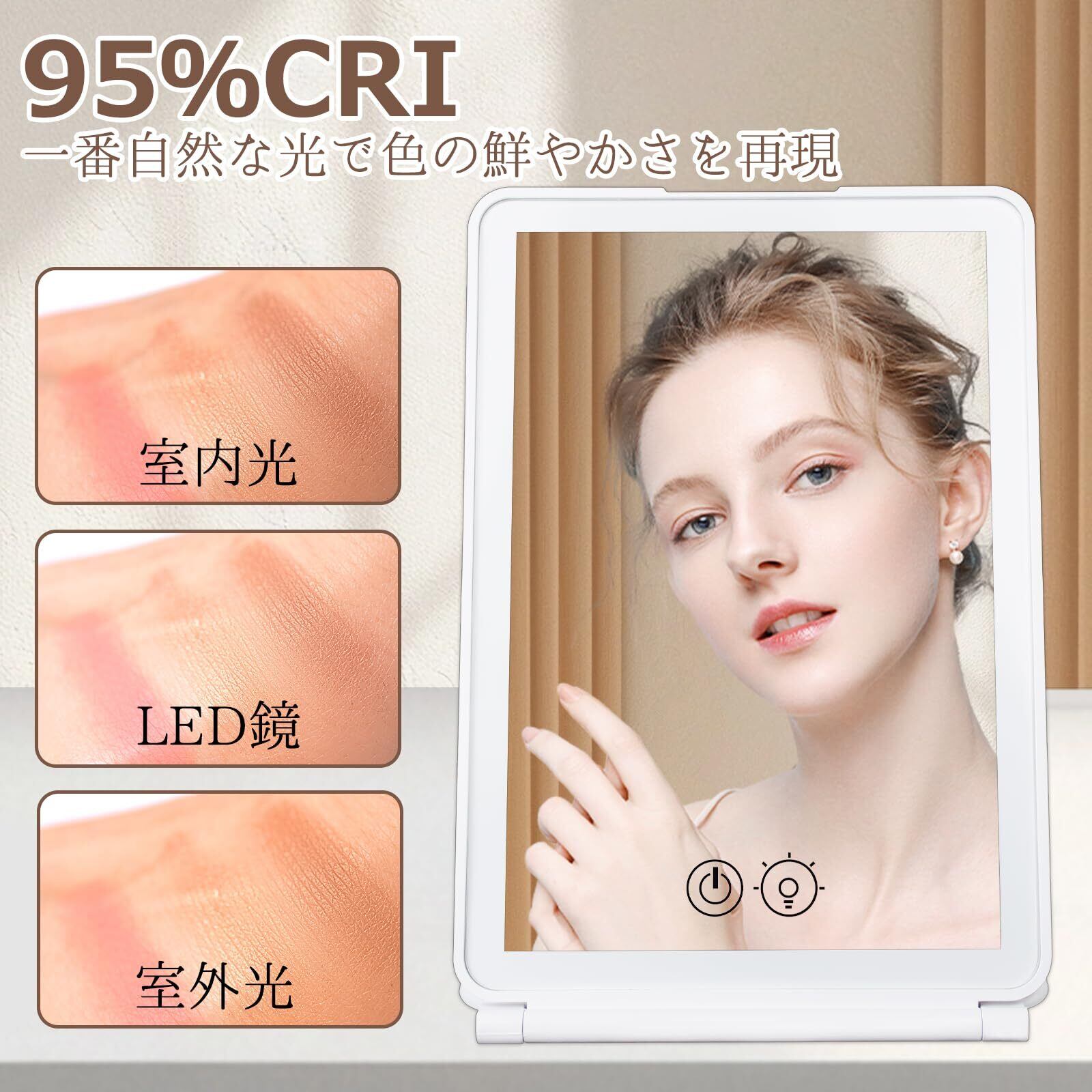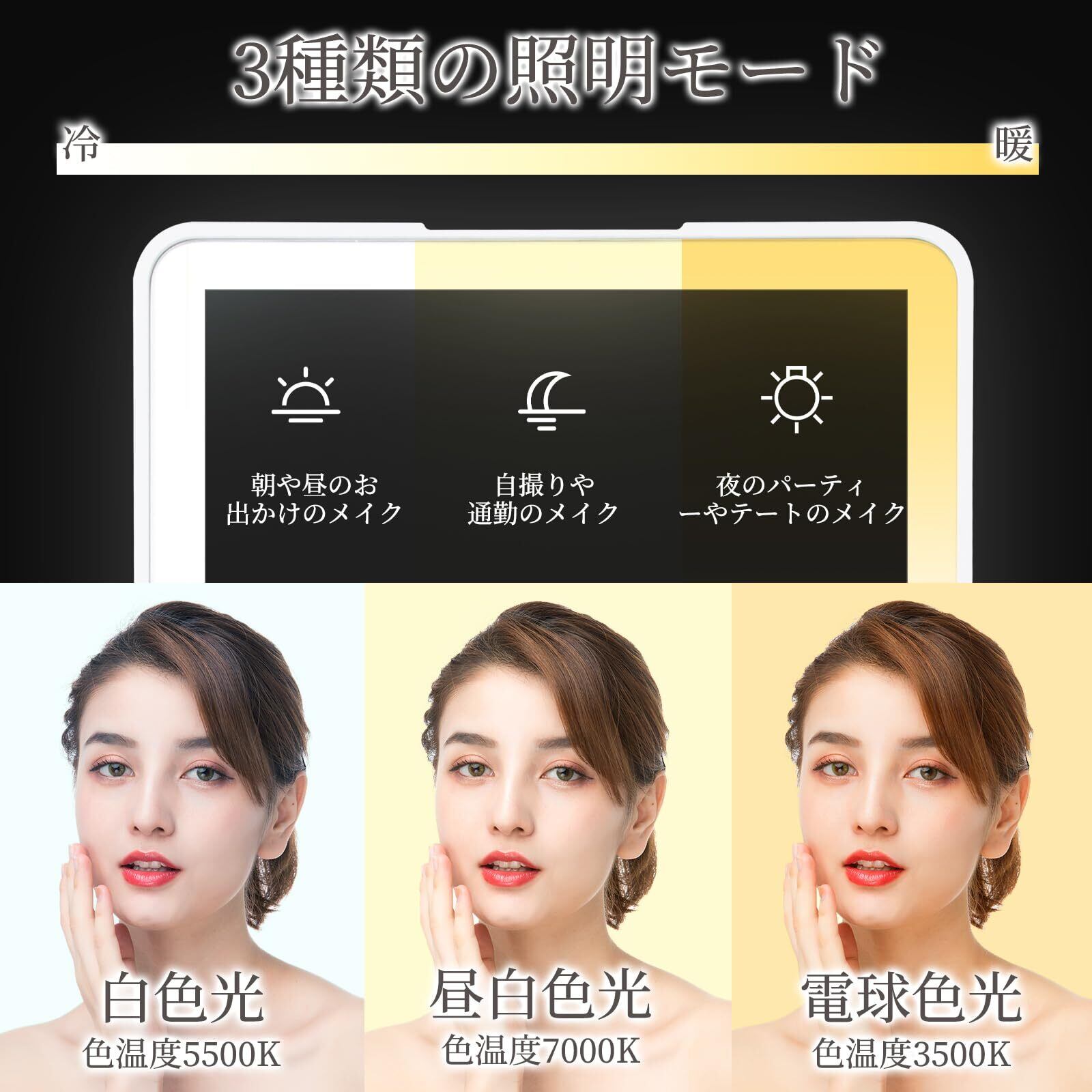 【三色照明モード】三色LED化粧鏡は軽いタッチですぐ点灯と色温度の切り替えができます。5500K白色光、7000K昼白色光、3500K電球色光の3種類色温度で室内から室外まで、朝から夜までのほぼすべて場所の環境光を再現し、一日中何処でも完璧なメイクができます。