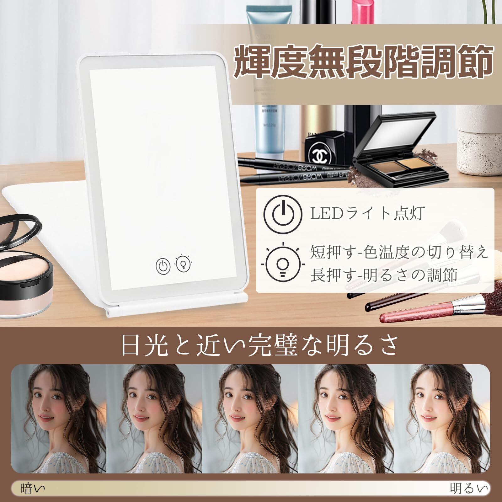 【無段階輝度調節】女優ミラーは操作簡単な設計で、ボタン長押しだけで明るさを無段階調整ができます。調節した明るさや光色などを自動的に記憶し、次回使用時に便利です。日光と近い完璧な明るさでメイクでき、初心者も手軽くに卓上化粧鏡で完璧なメイクに導きます。