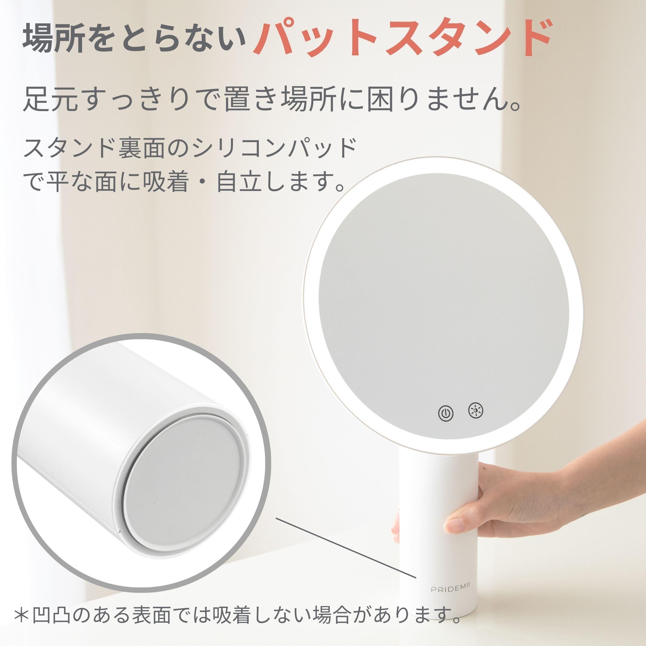 PRIDEMII ポール型 多機能LED女優ミラー 場所を取らないパッドスタンド バッテリー内蔵 簡単タッチ操作 自動消灯 明るさメモリ 無段階調整 3色LED 化粧鏡 化粧ミラー 卓上ミラー ライト付き(オフホワイト)