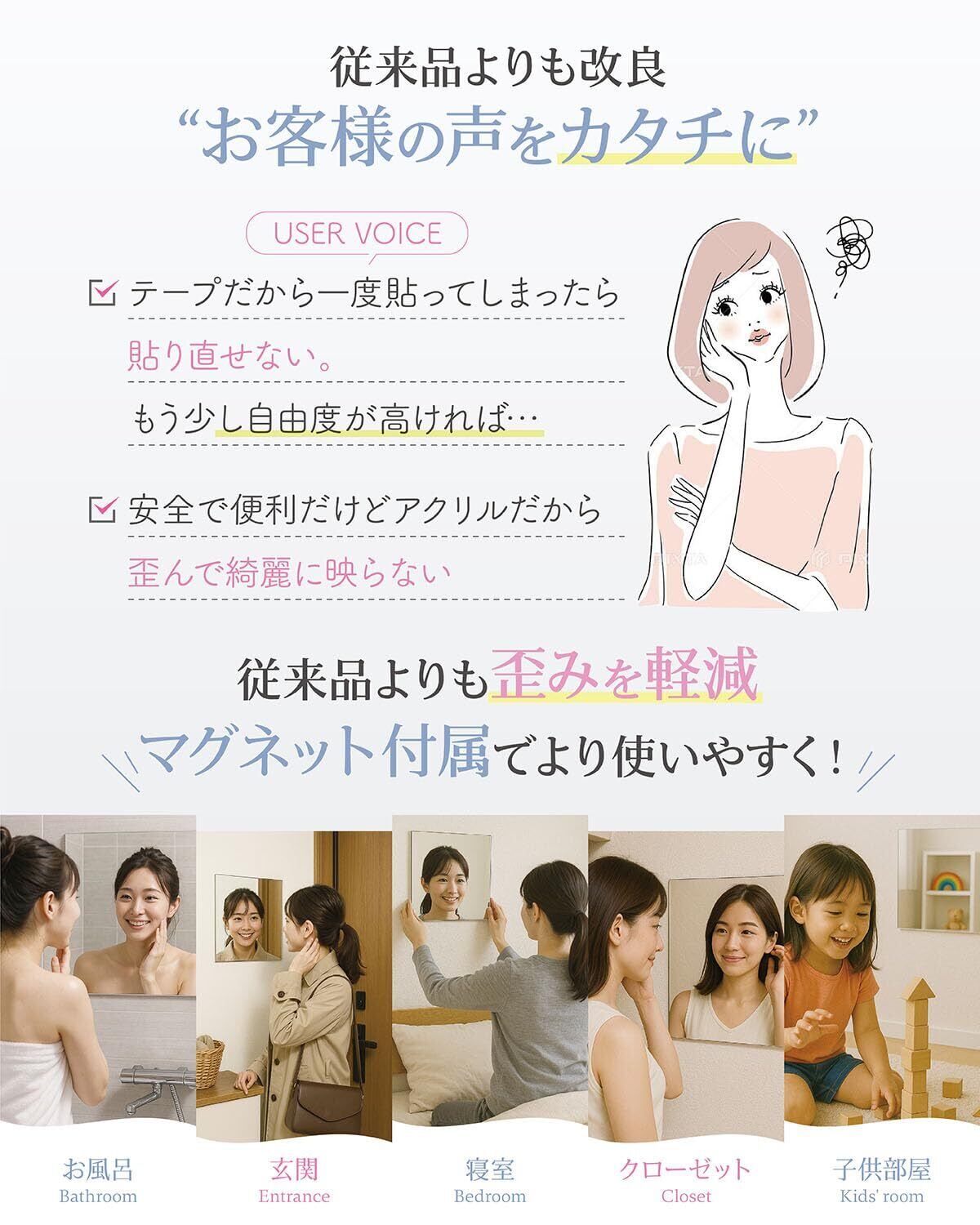 【マグネット対応で設置場所自由】 ミラーの裏には両面テープに加え、マグネットも付属。 冷蔵庫・玄関ドア・ロッカーなどの鉄面にもピタッと貼れて、設置の自由度が高いのも特長です。 もちろん壁紙や木製の壁にも設置でき、賃貸住宅でも安心して使えるよう、跡が残らない剥がし方も説明書で丁寧にご案内しています。