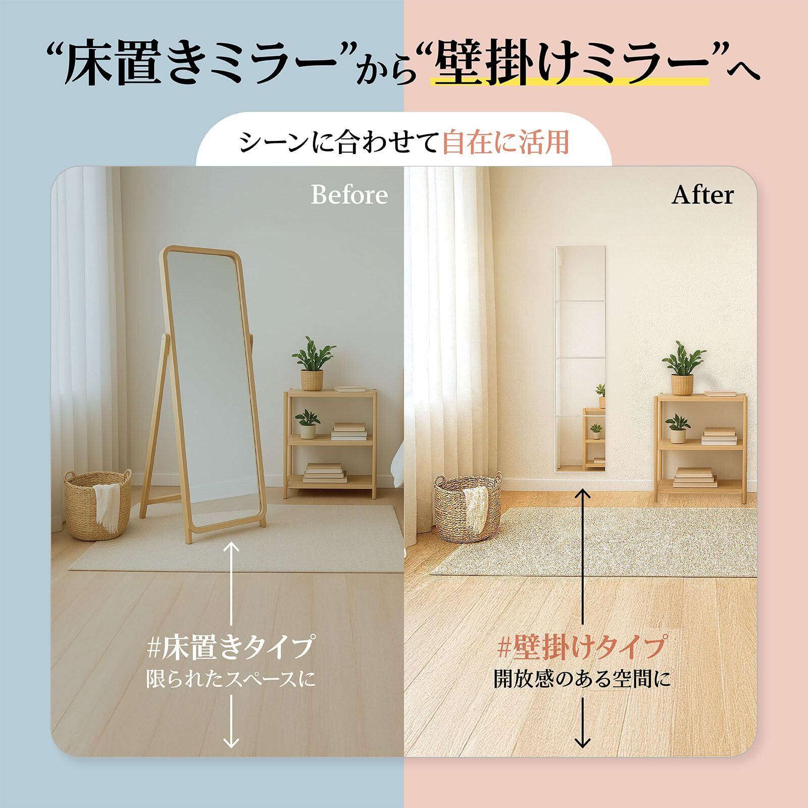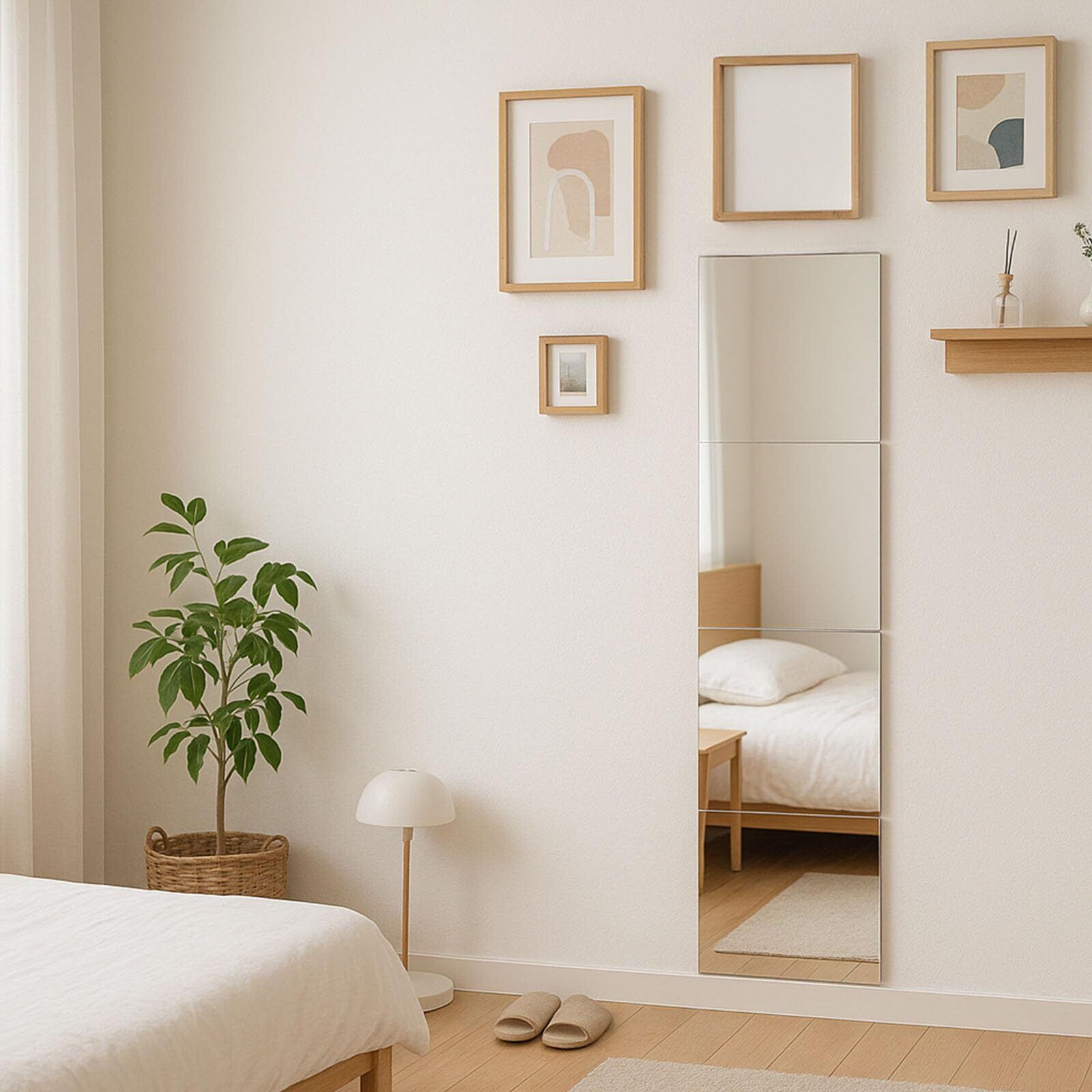【歪みにくい高品質アクリル】 「アクリルミラーは歪むのでは?」という声にもお応えして、厚みと平面精度にこだわった素材を使用。 30×30cmのミラー4枚を並べて、省スペースながら全身をしっかり映せます。 玄関・クローゼット・子供部屋・浴室など、さまざまな場所で活躍します。