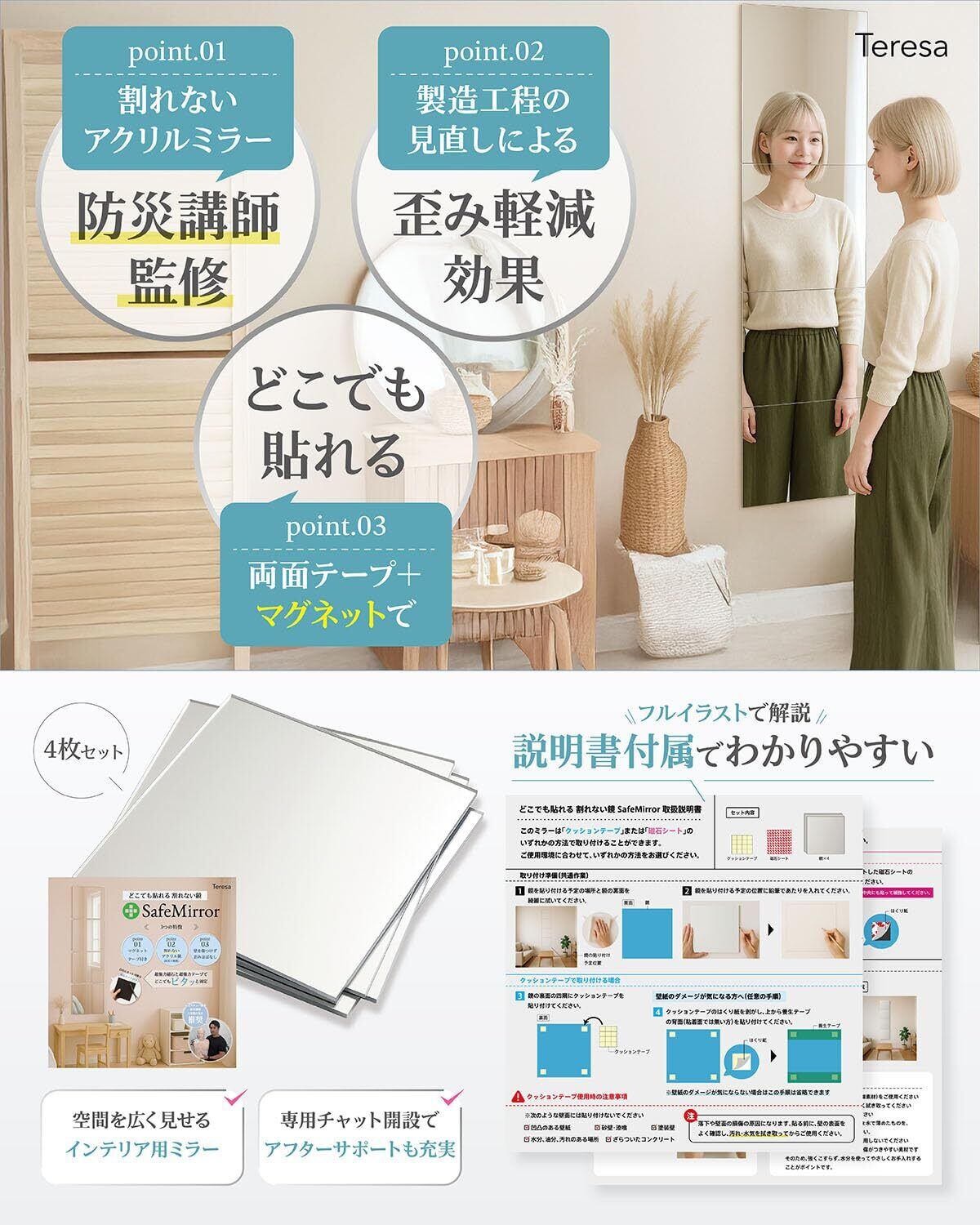 【マグネット&シール付き 歪みにくい 割れない】壁掛け 鏡 SafeMirror アクリルミラー 全身鏡 軽量 貼るだけ 賃貸 玄関 浴室 子供部屋 姿見 防災士監修 (30cm×30cm 4枚)
