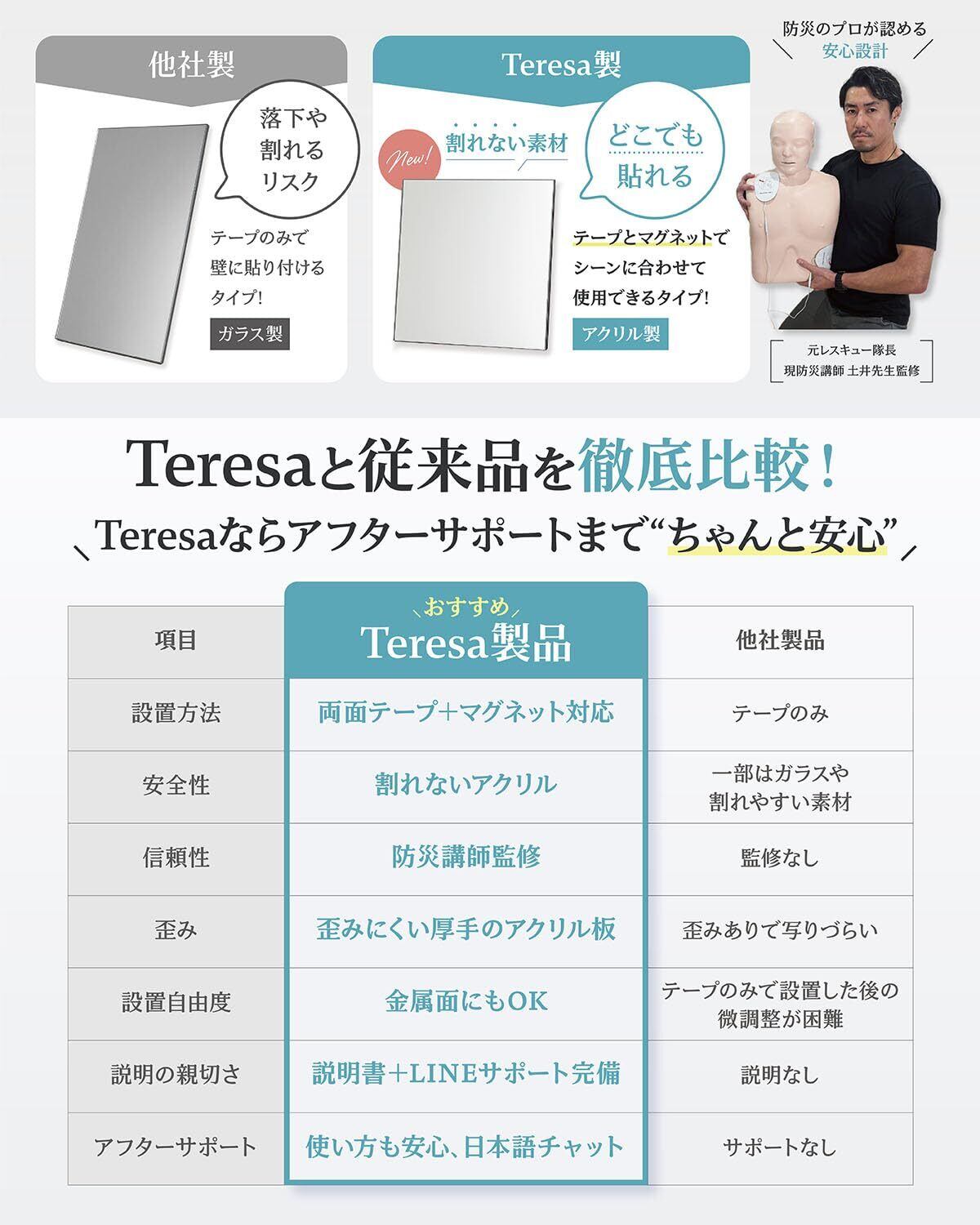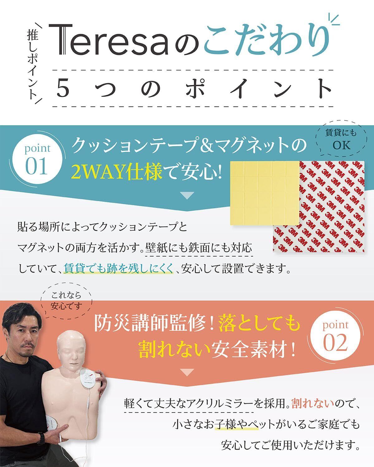 【防災士監修で、家族の安心を守る】 Teresaのミラーは、防災士の監修を受けた「安全性重視」の設計。 災害時にも飛散しにくく、避難所・施設・高齢者宅などにもおすすめです。