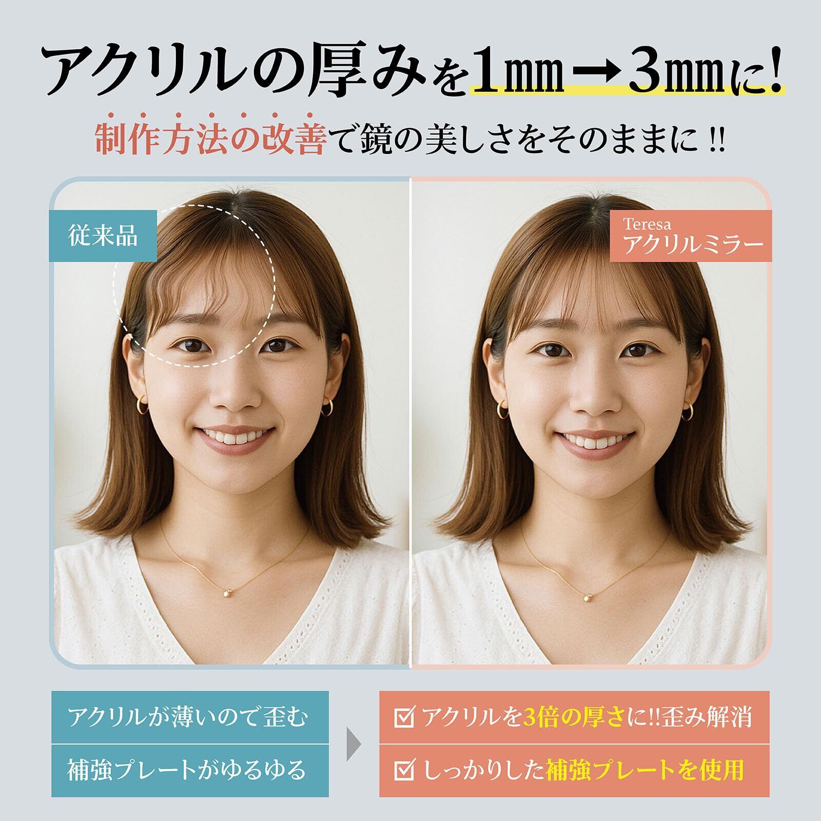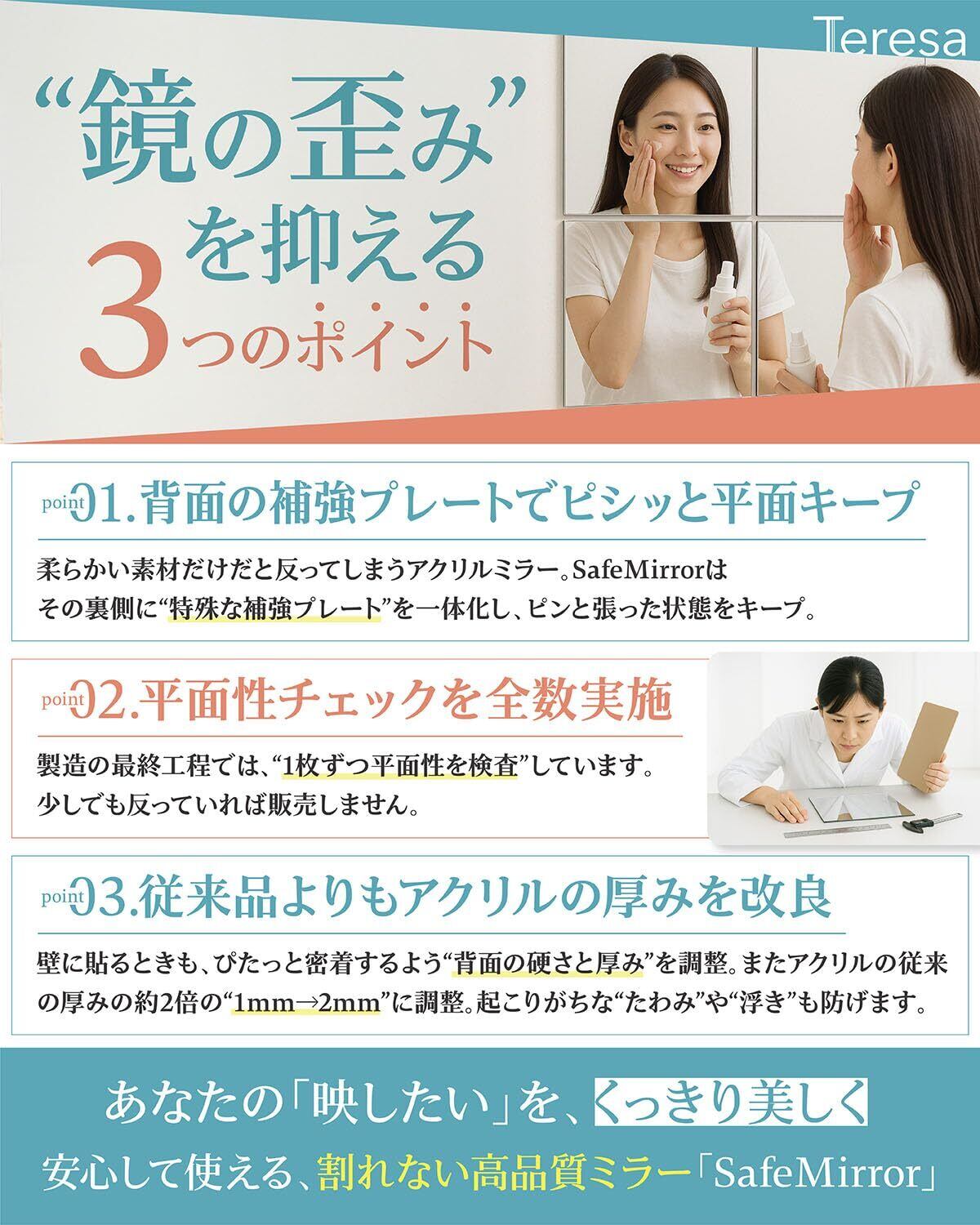 【割れない × 歪みにくい × 貼るだけ】 毎日の「身だしなみチェック」をもっと安心・もっと自由に。 Teresaの壁掛けミラーは、割れないアクリル素材を採用した安全・軽量設計。 ガラス製と違って落ちても飛び散らず、小さなお子様やペットがいるご家庭でも安心してお使いいただけます。